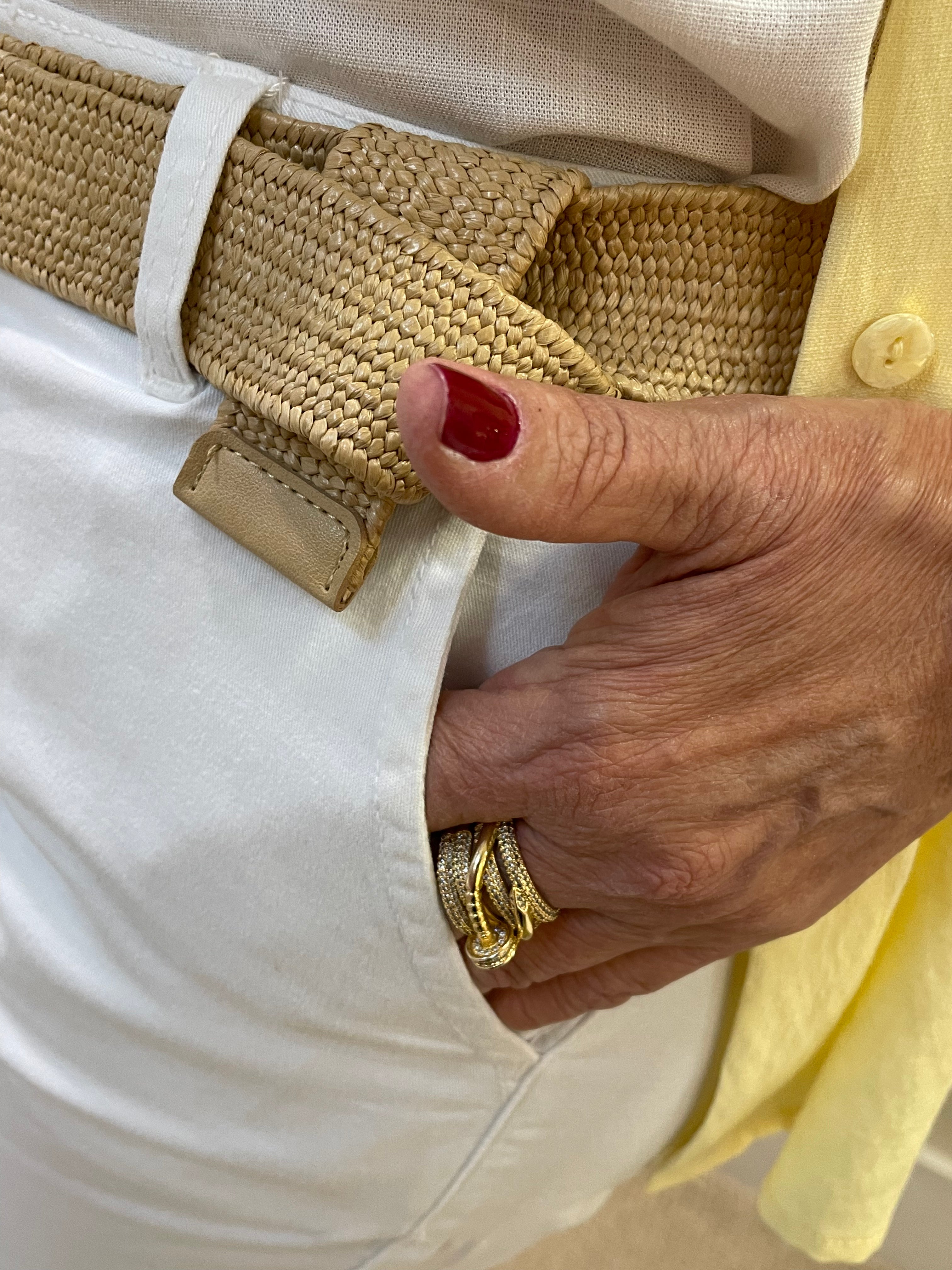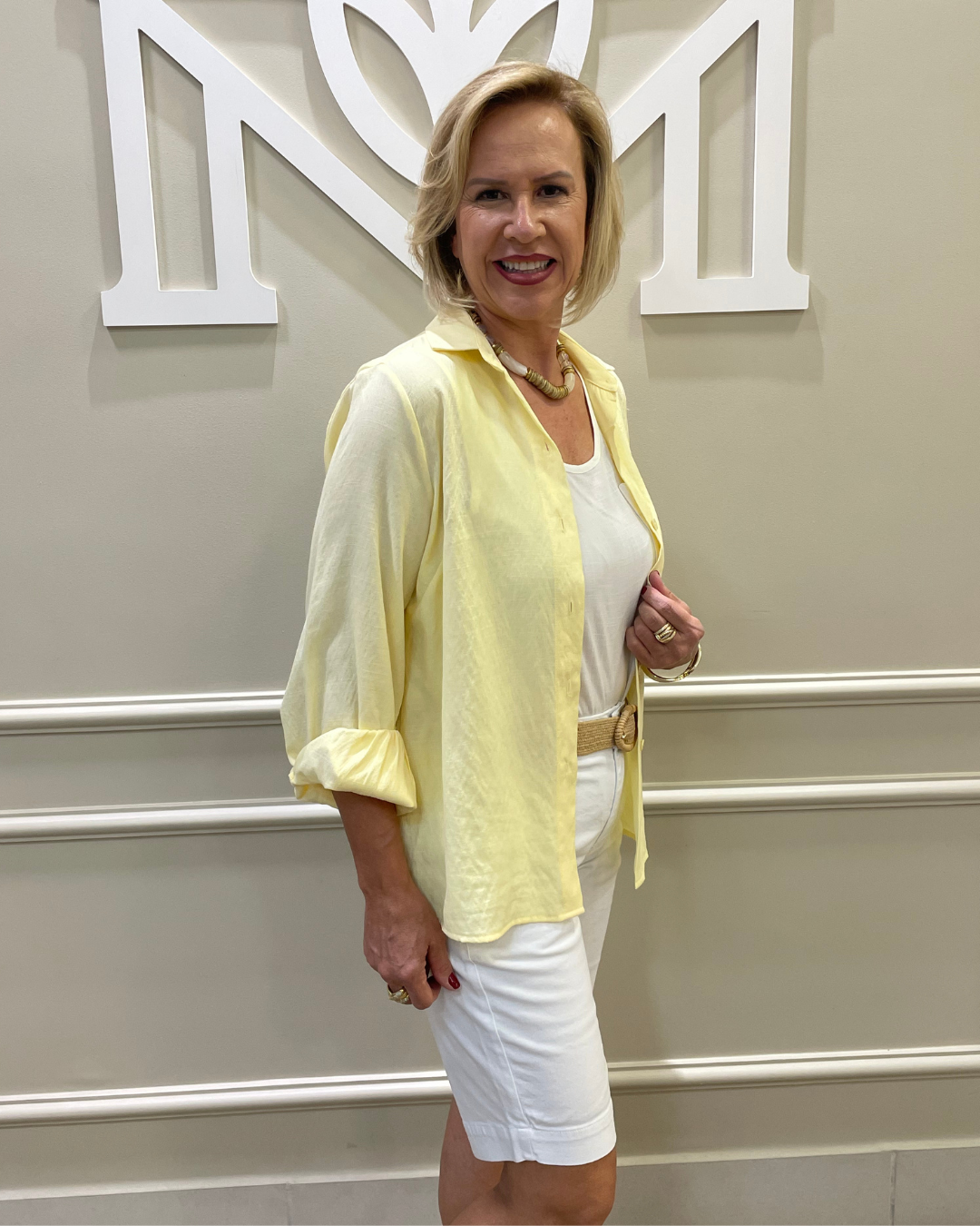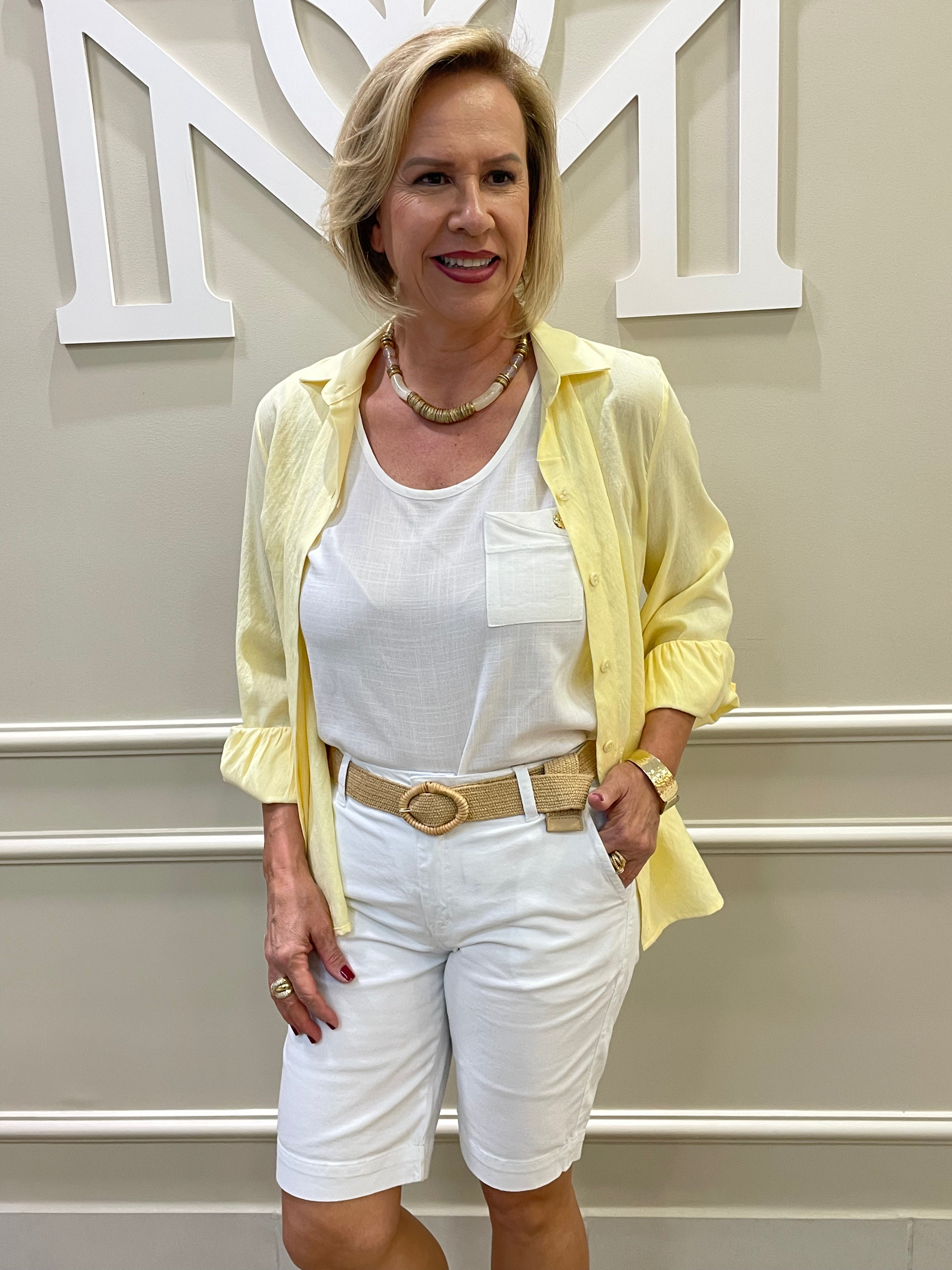 A bermuda da imagem é de modelagem reta, com comprimento até acima do joelho. Confeccionado em tecido branco, tem caimento leve e elegante, ideal para compor looks casuais sofisticados. Possui bolsos frontais funcionais e passantes para cinto, garantindo praticidade e estilo. O design clean e versátil permite transferências tanto com camisas leves quanto com blusas mais ajustadas, sendo uma peça curativa para o verão.