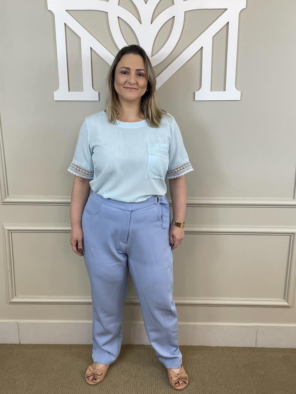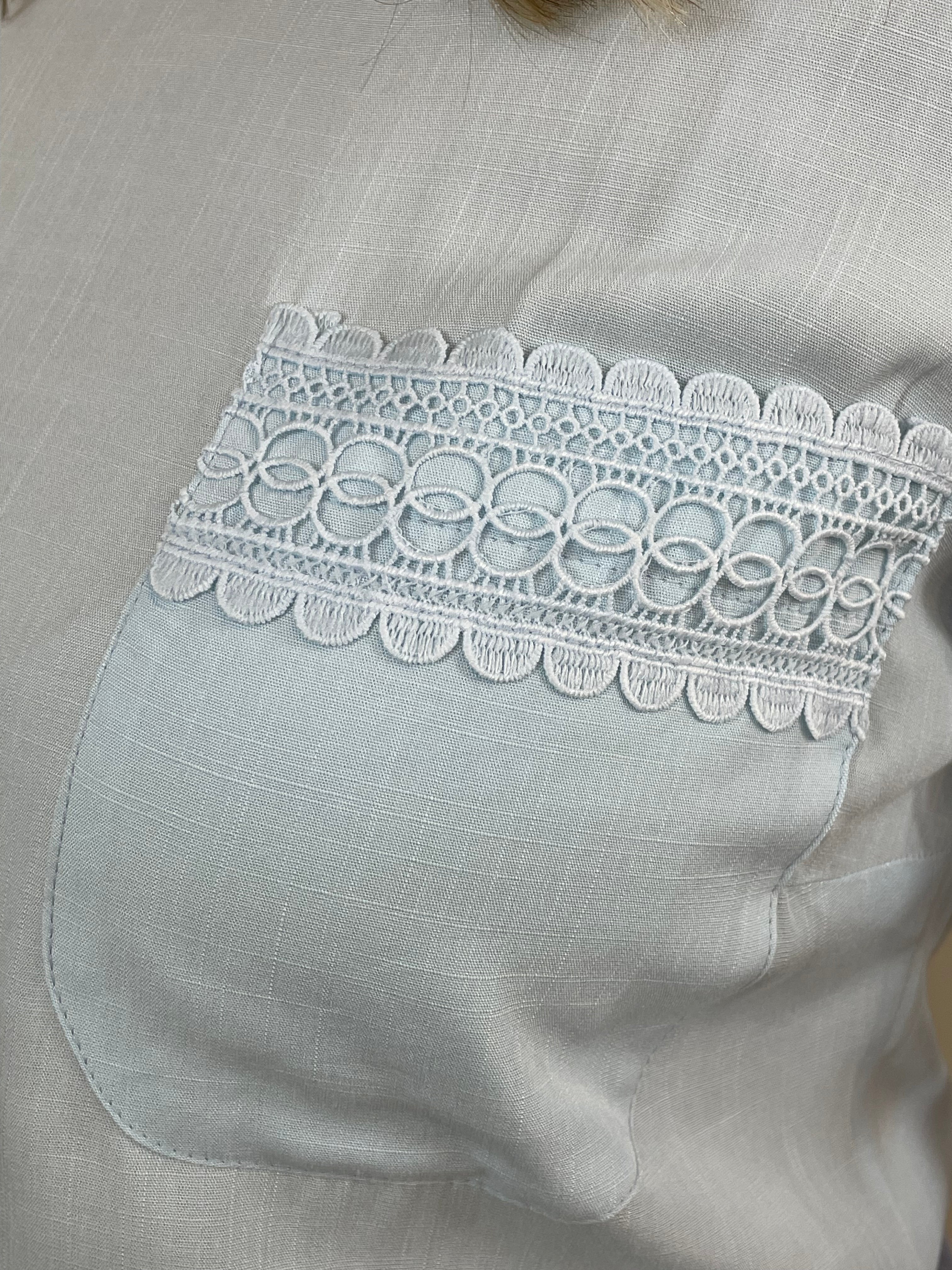 Blusa em tom azul claro, confeccionada em tecido leve e fluido que garante conforto e elegância. O modelo possui mangas curtas com delicado detalhe em renda, que também aparece no bolso frontal, trazendo um toque feminino e sofisticado à peça. Com caimento solto e modelagem clássica, é perfeita para compor looks leves e versáteis. Ideal para o dia a dia ou para produções mais refinadas com um toque de suavidade.