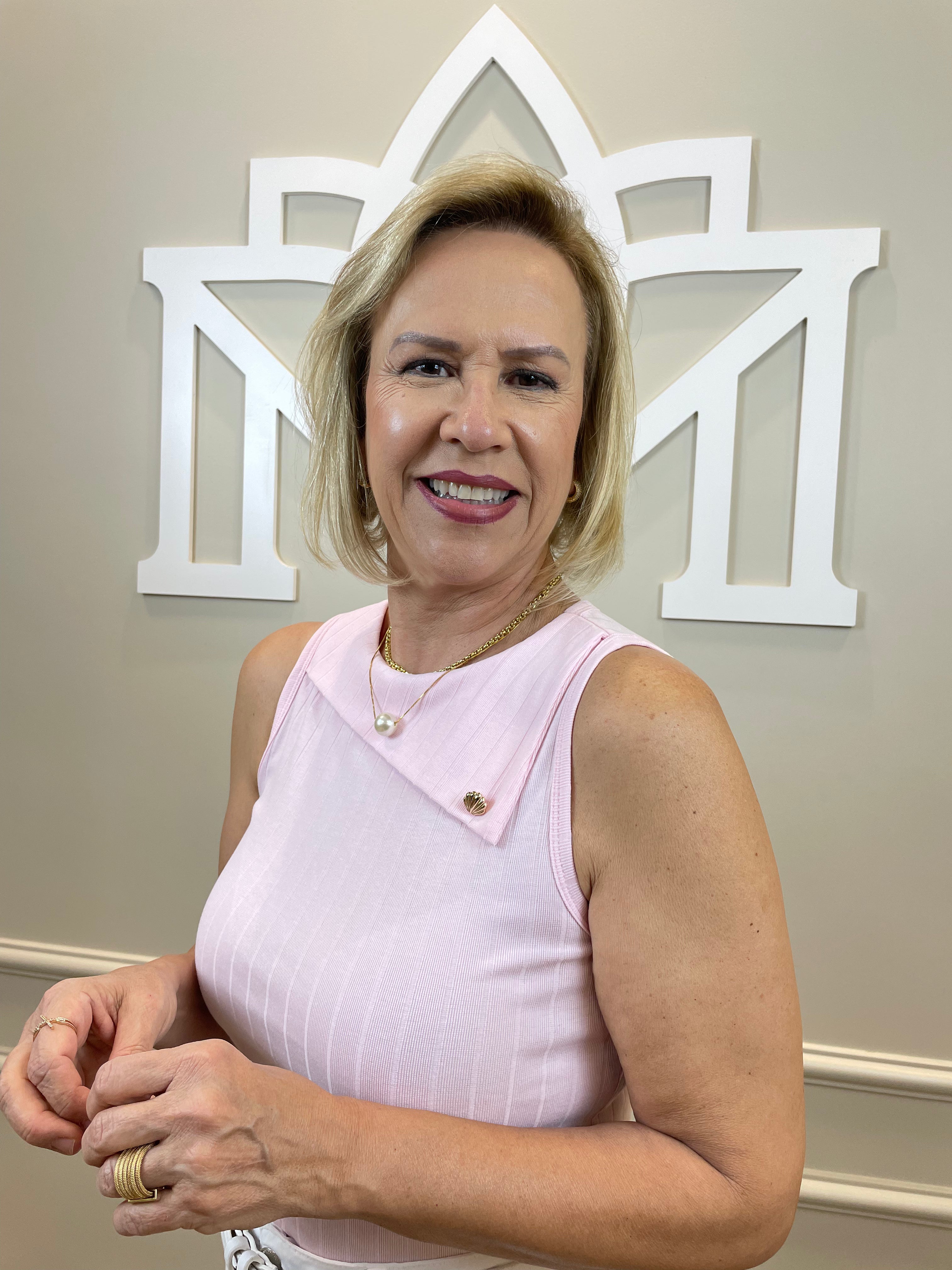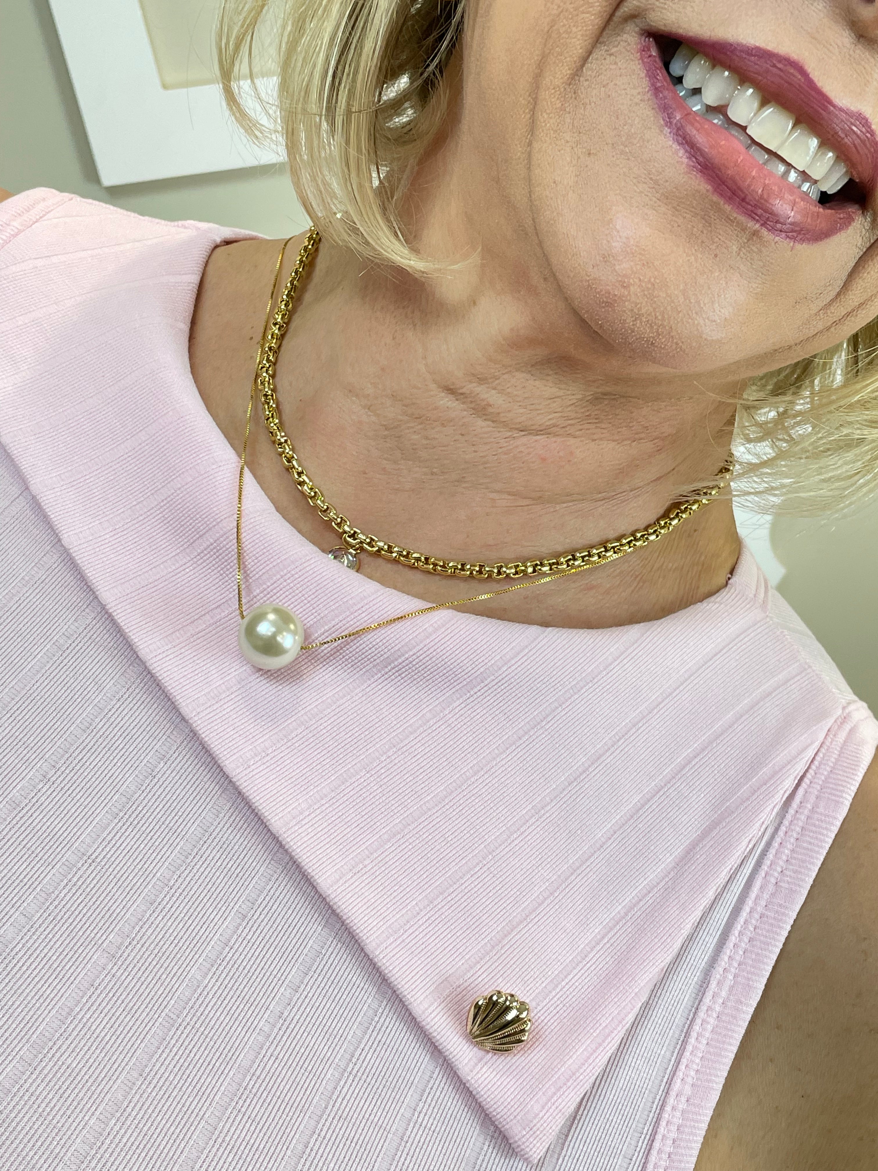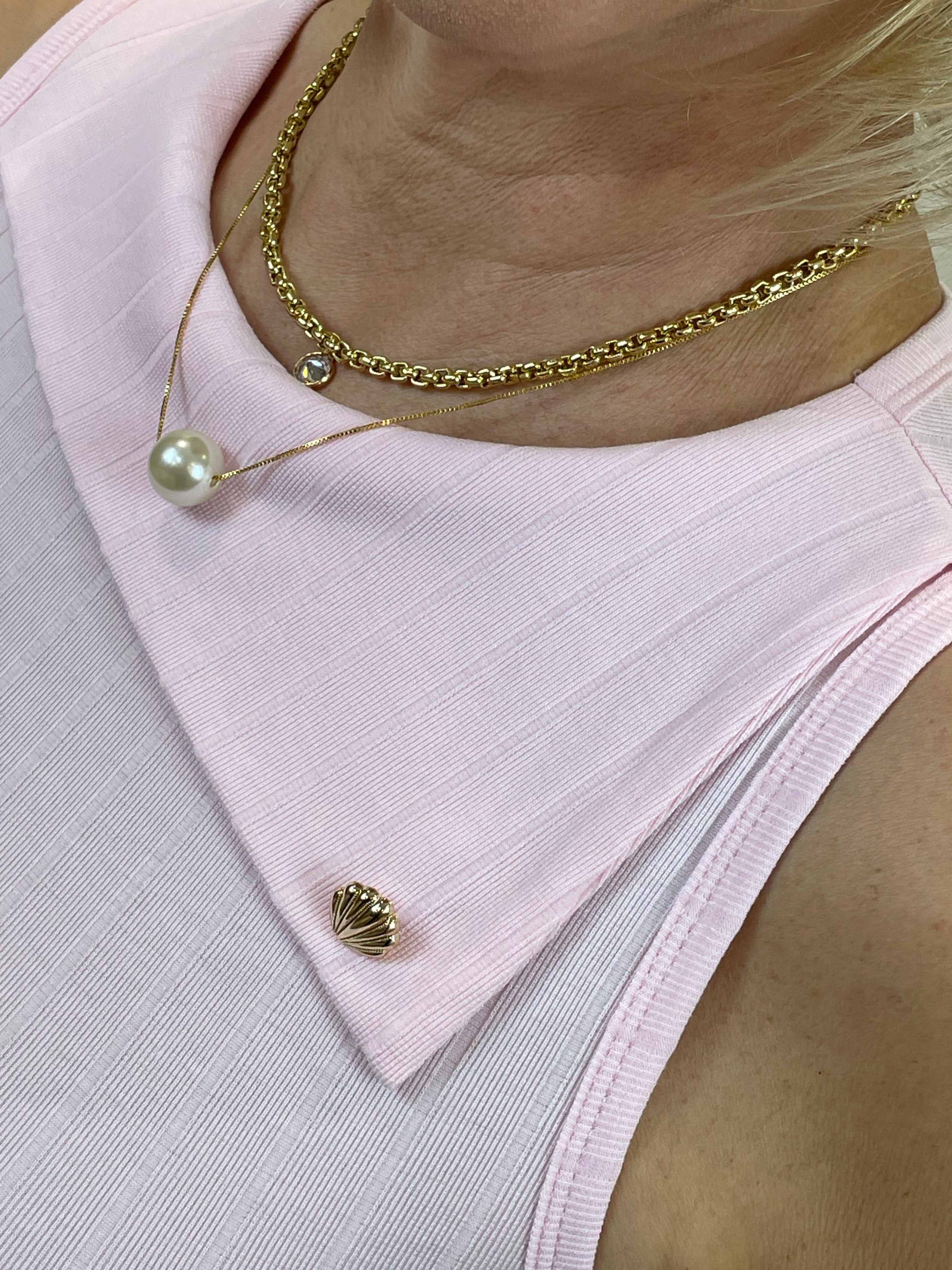 A blusa da imagem é sem mangas e confeccionada em um tecido leve, com textura levemente canelada. Ela tem um tom de rosa claro, suave e delicado, transmitindo um ar feminino e elegante. O decote é arredondado e conta com um detalhe charmoso na gola — uma pequena sobreposição de tecido com duas aplicações de botões perolados, que dão um toque sofisticado à peça. O caimento é ajustado ao corpo, valorizando a silhueta de forma discreta e refinada.