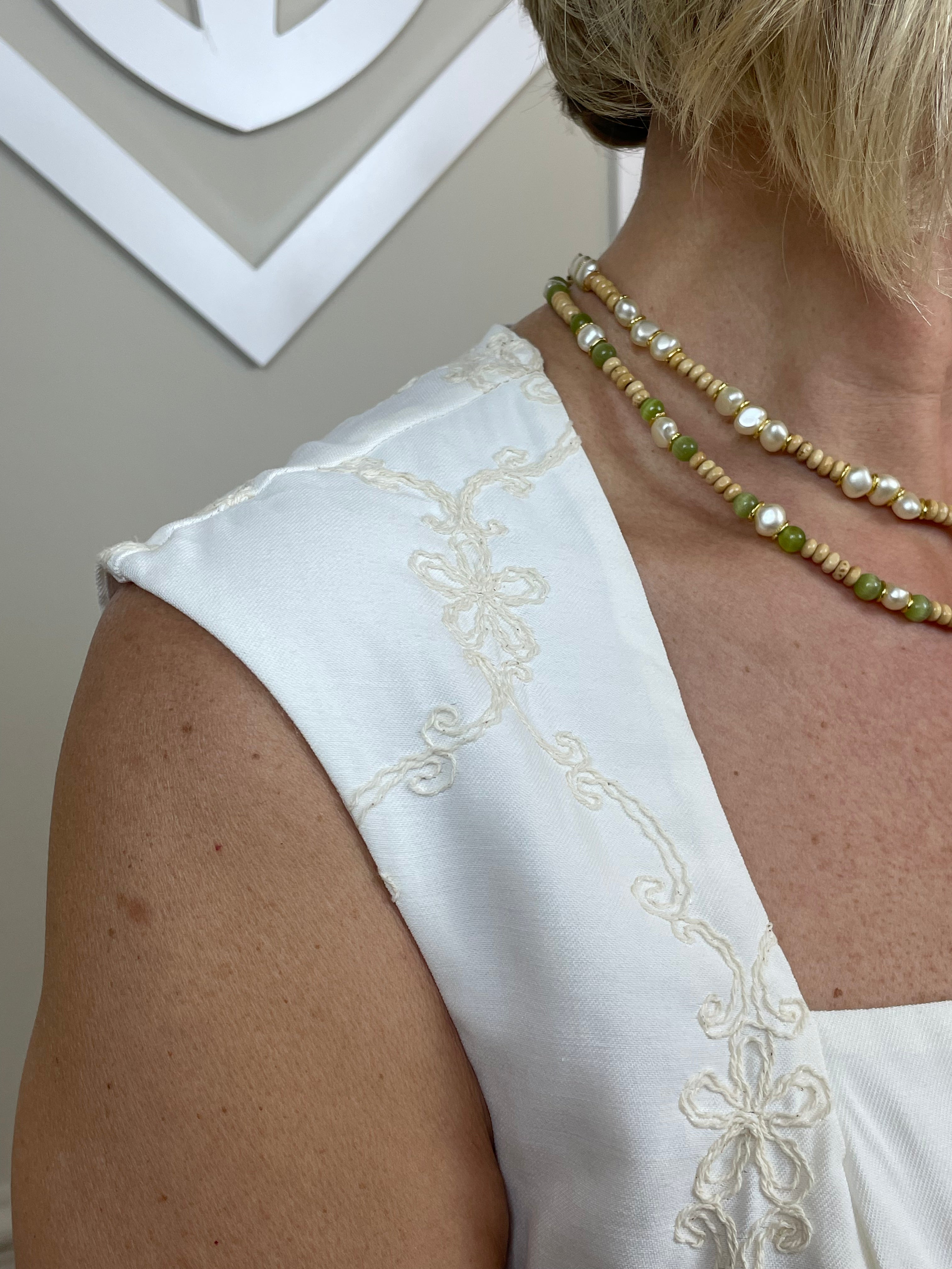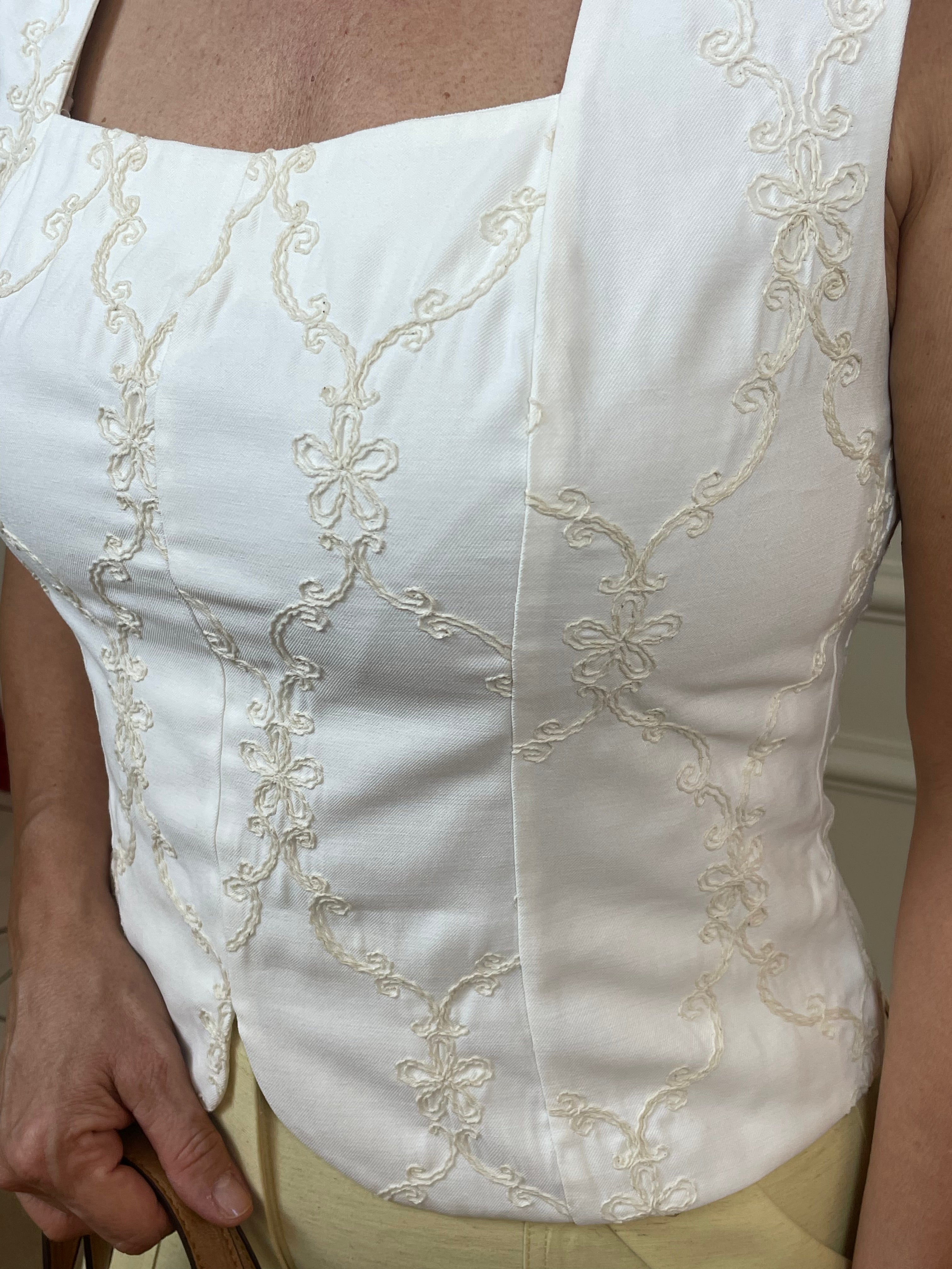 A blusa da imagem possui um decote quadrado e é confeccionada em um tecido claro, com bordados delicados em padrão floral, conferindo um toque sofisticado e romântico à peça. Sem mangas, ela tem uma modelagem ajustada ao corpo que destaca a silhueta de forma elegante. A barra da blusa é levemente arredondada e centralmente mais curta, o que adiciona um charme extra ao visual. O tecido parece estruturado, o que contribui para o caimento impecável. Ideal para compor looks elegantes e refinados para ocasiões diurnas ou eventos casuais sofisticados.