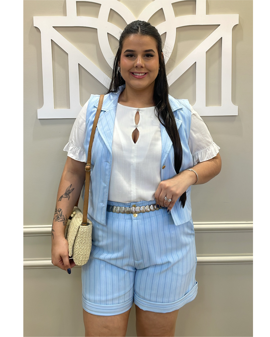 A blusa off é pura delicadeza! Confeccionada em tecido leve e fluido, ela possui gola redonda e detalhe de abertura frontal com fecho em strass, que traz um toque sofisticado ao visual. As mangas curtas têm acabamento levemente franzido com babadinho, acrescentando um ar feminino e romântico à peça. Versátil e charmosa, combina perfeitamente com looks de alfaiataria ou produções mais casuais.