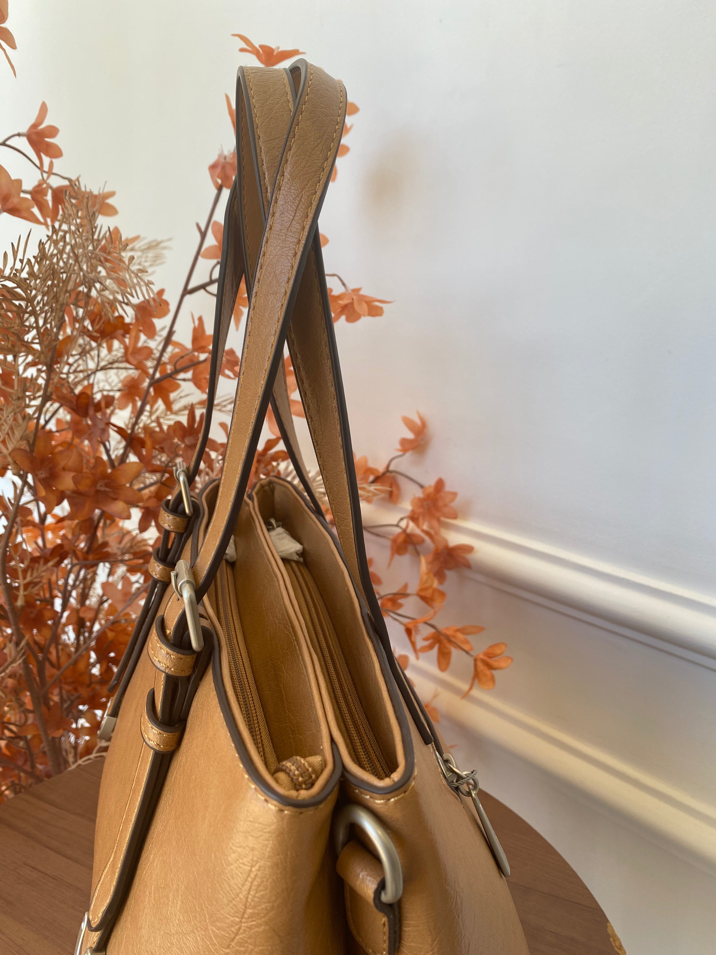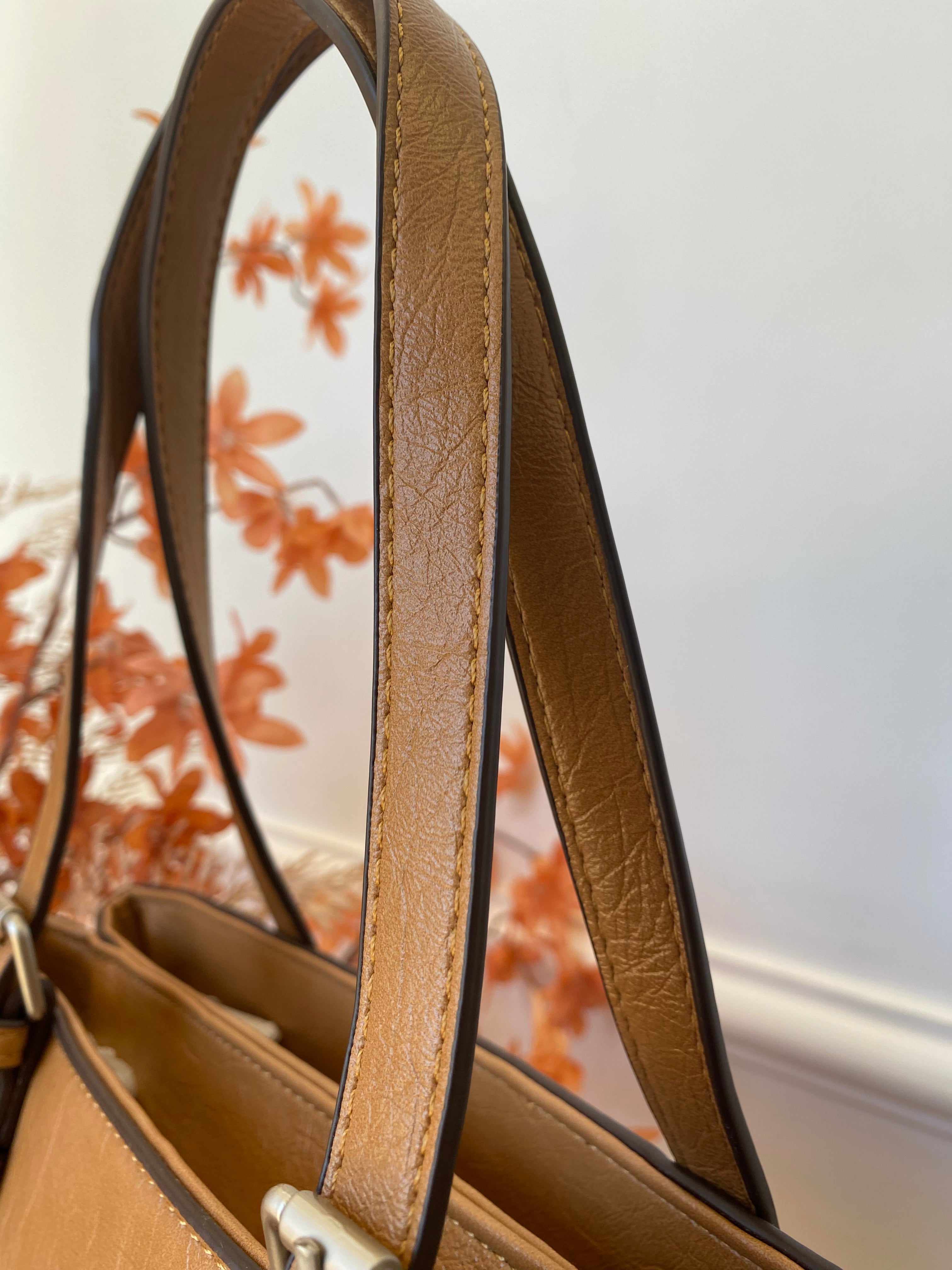 Bolsa estruturada na cor caramelo, confeccionada em material sintético com textura suave e leve brilho. Possui alças duplas ajustáveis com fivelas metálicas e detalhes delicados nas pontas, garantindo um toque sofisticado ao design. O modelo conta com divisórias amplas e fechamento em zíper, ideal para manter seus itens bem organizados no dia a dia. O tom caramelo é versátil e atemporal, combinando facilmente com diferentes estilos e ocasiões. Um acessório elegante e funcional para compor produções clássicas ou modernas.