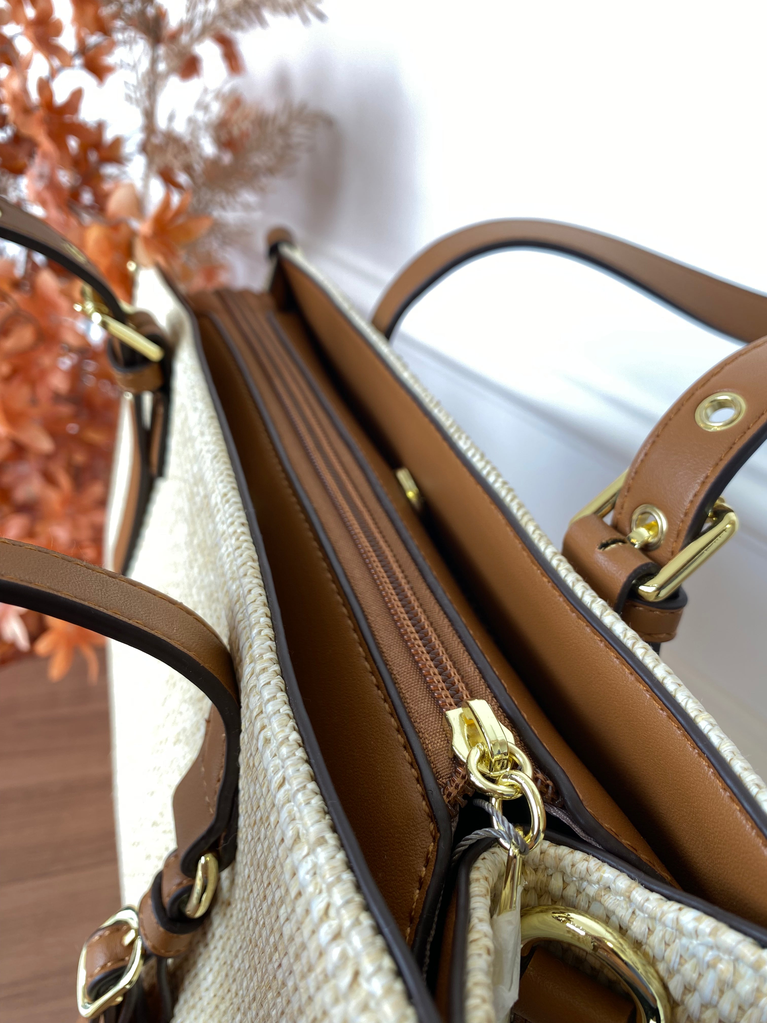 Bolsa estruturada em formato retangular, com corpo principal confeccionado em palha ou material que imita palha trançada, oferecendo um visual leve e natural, ideal para climas quentes ou looks casuais-chiques. As bordas, alças e acabamentos são em couro sintético ou legítimo na cor marrom caramelo, proporcionando contraste elegante e acabamento refinado.