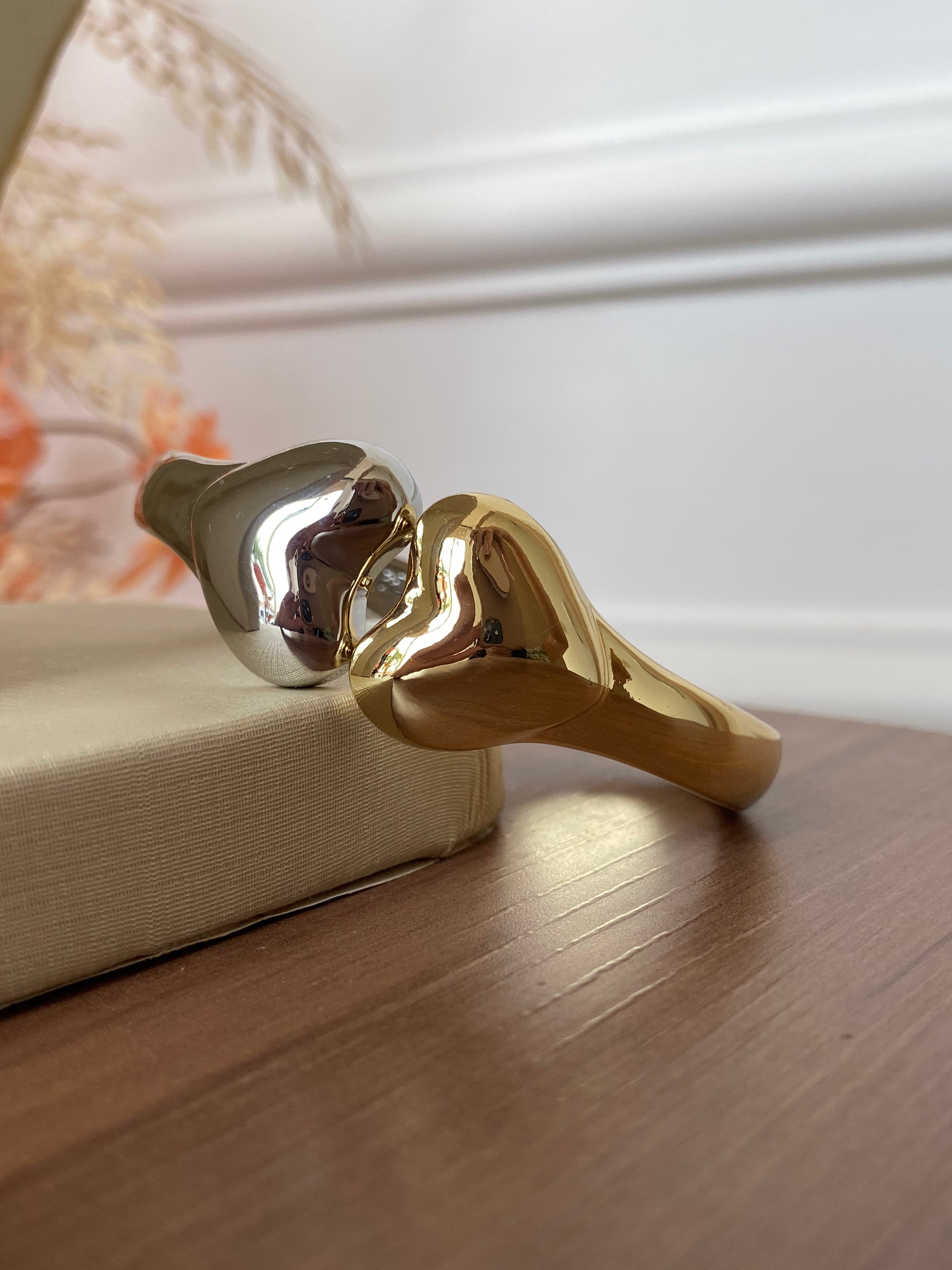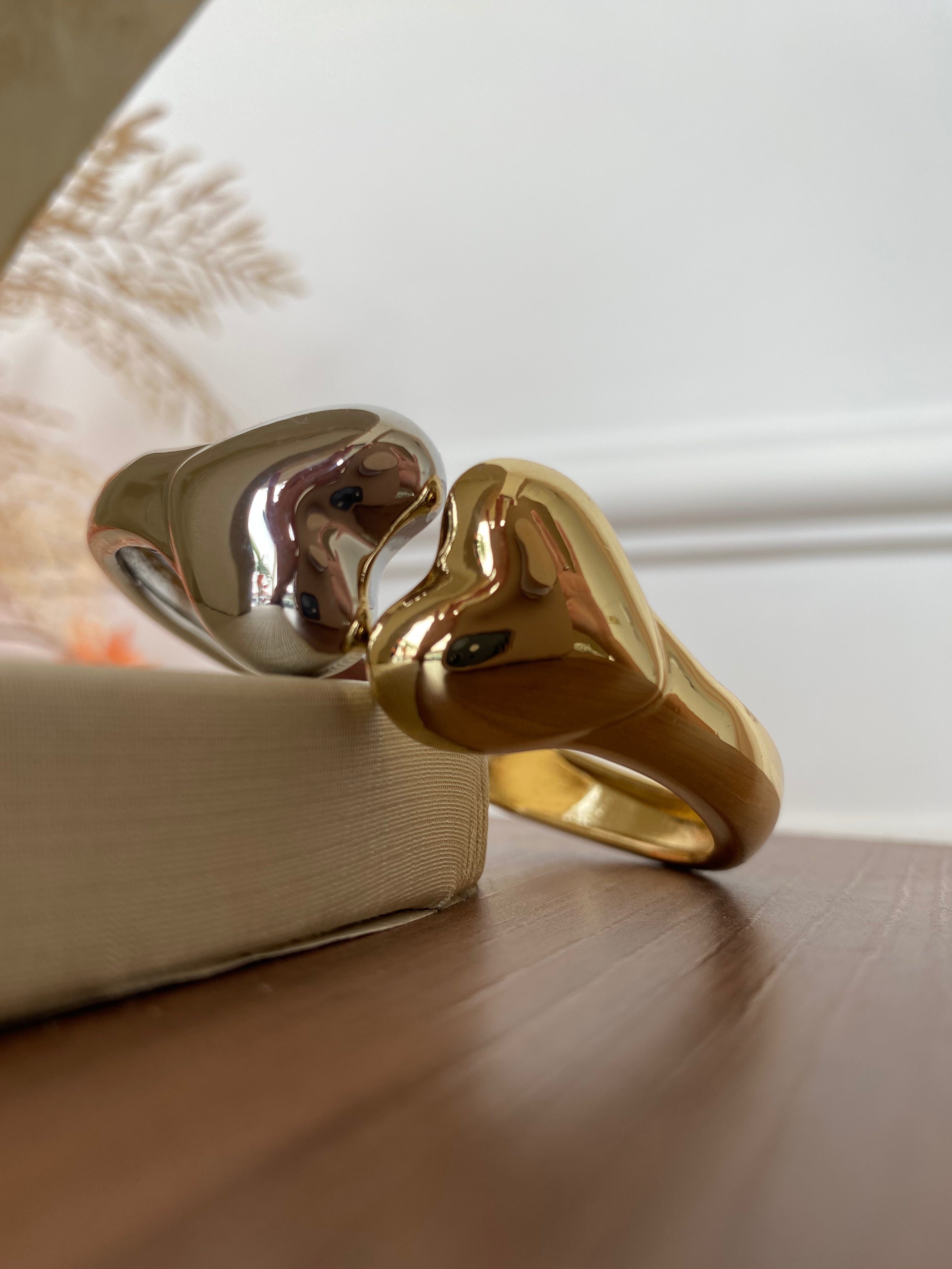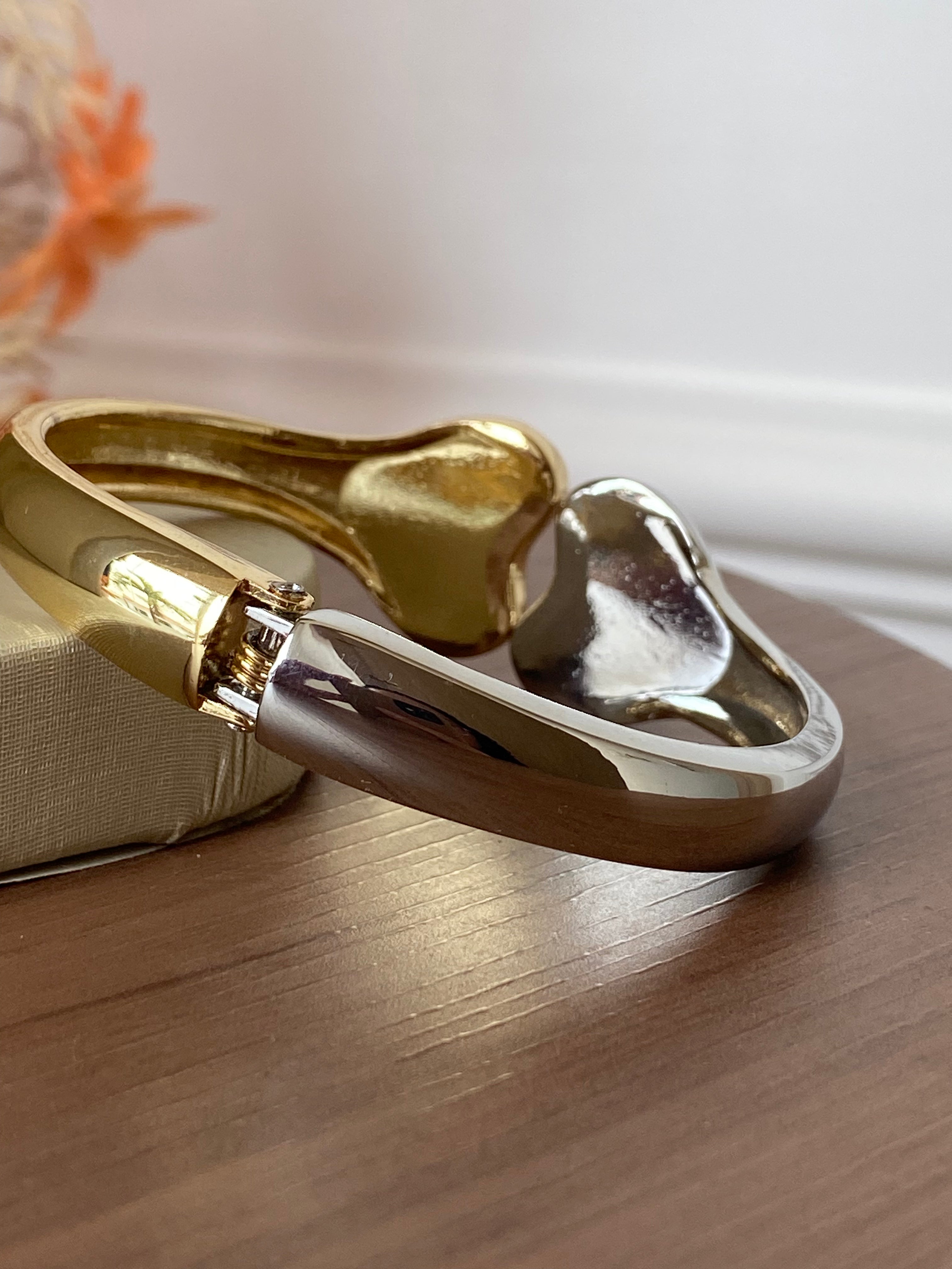 Esse bracelete é uma peça moderna e sofisticada, composta por duas metades metálicas que se encontram em um design fluido e escultural. Um dos lados possui acabamento prateado espelhado, enquanto o outro apresenta um tom dourado brilhante, criando um contraste elegante e contemporâneo. O formato orgânico, com curvas suaves e aparência polida, reflete a luz de forma delicada, dando um toque artístico e luxuoso à peça. Ideal para complementar looks elegantes e minimalistas, o bracelete transmite estilo e personalidade.