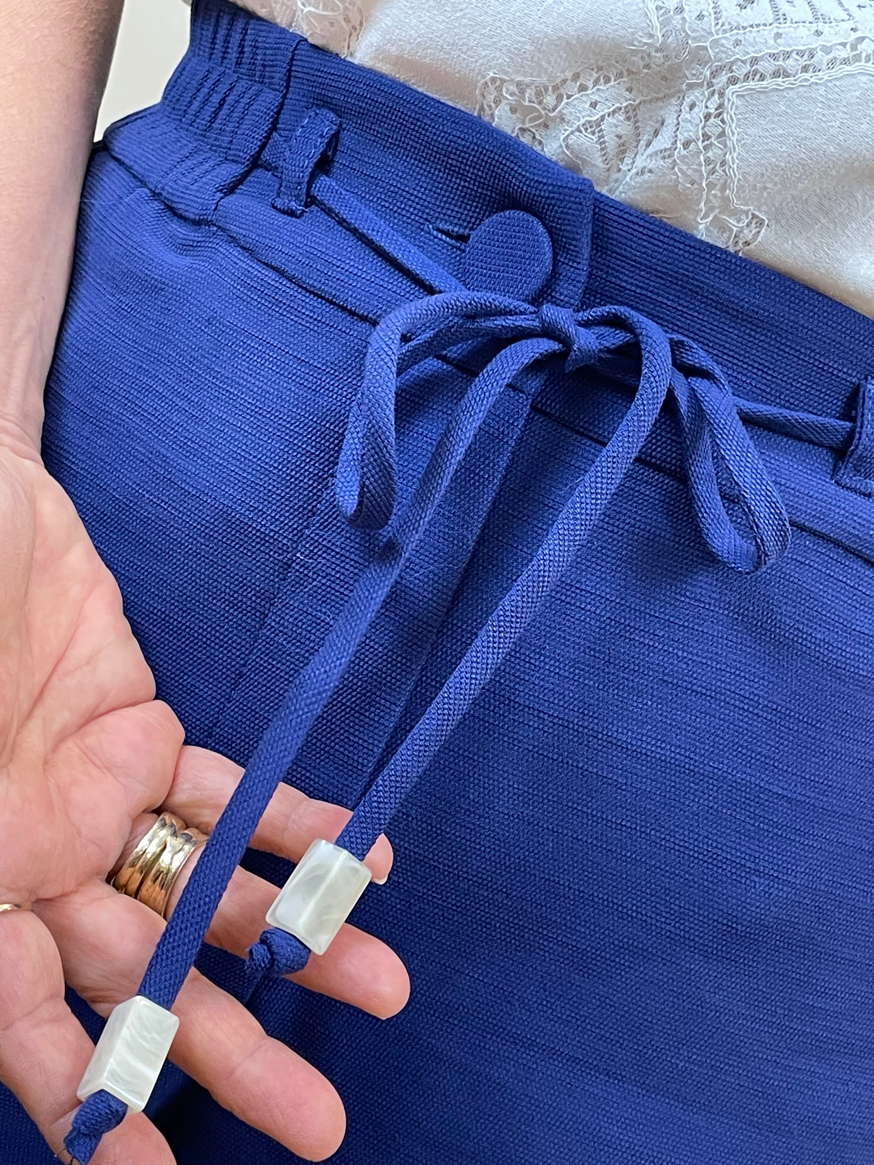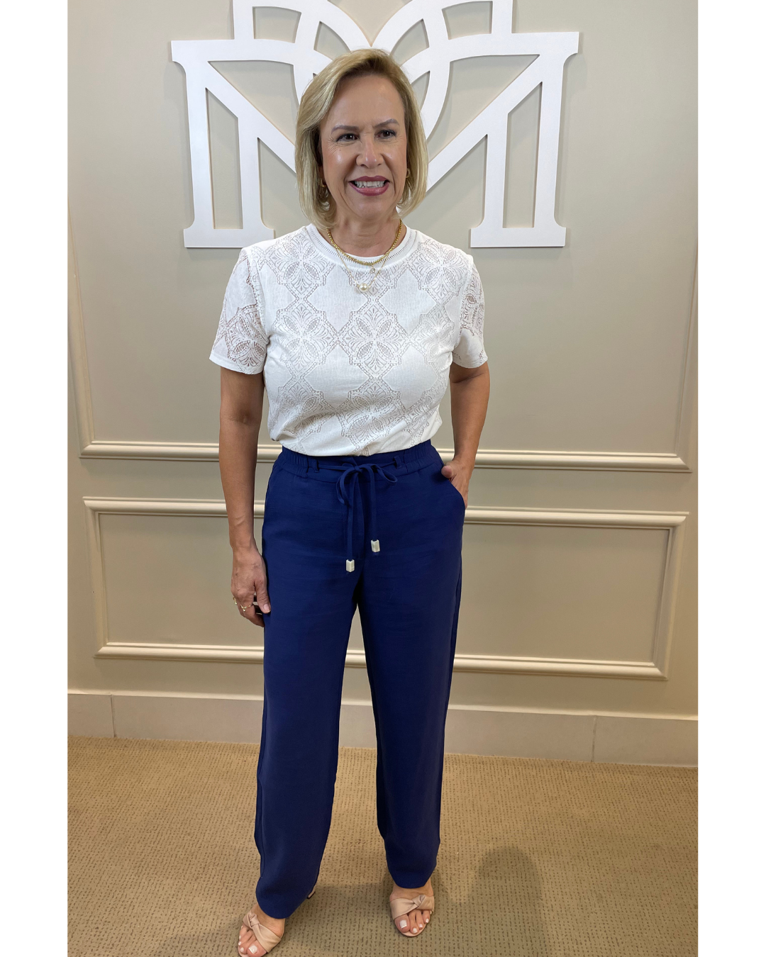 A calça azul marinho apresenta um corte reto e fluido, ideal para compor looks elegantes e confortáveis. Confeccionada em tecido leve, com ótimo caimento, ela proporciona liberdade de movimento e frescor, sendo perfeita para o dia a dia ou ocasiões casuais mais sofisticadas.