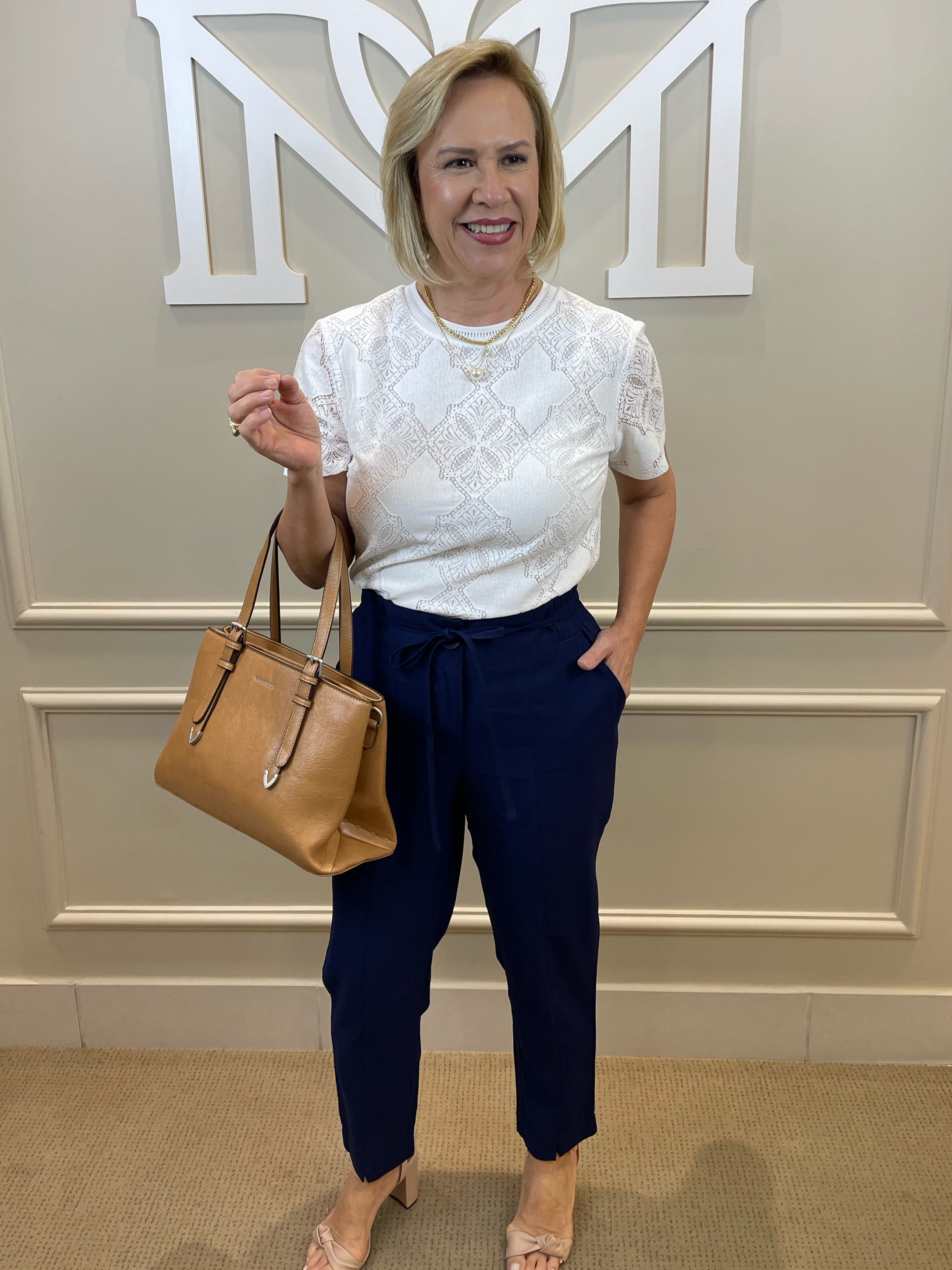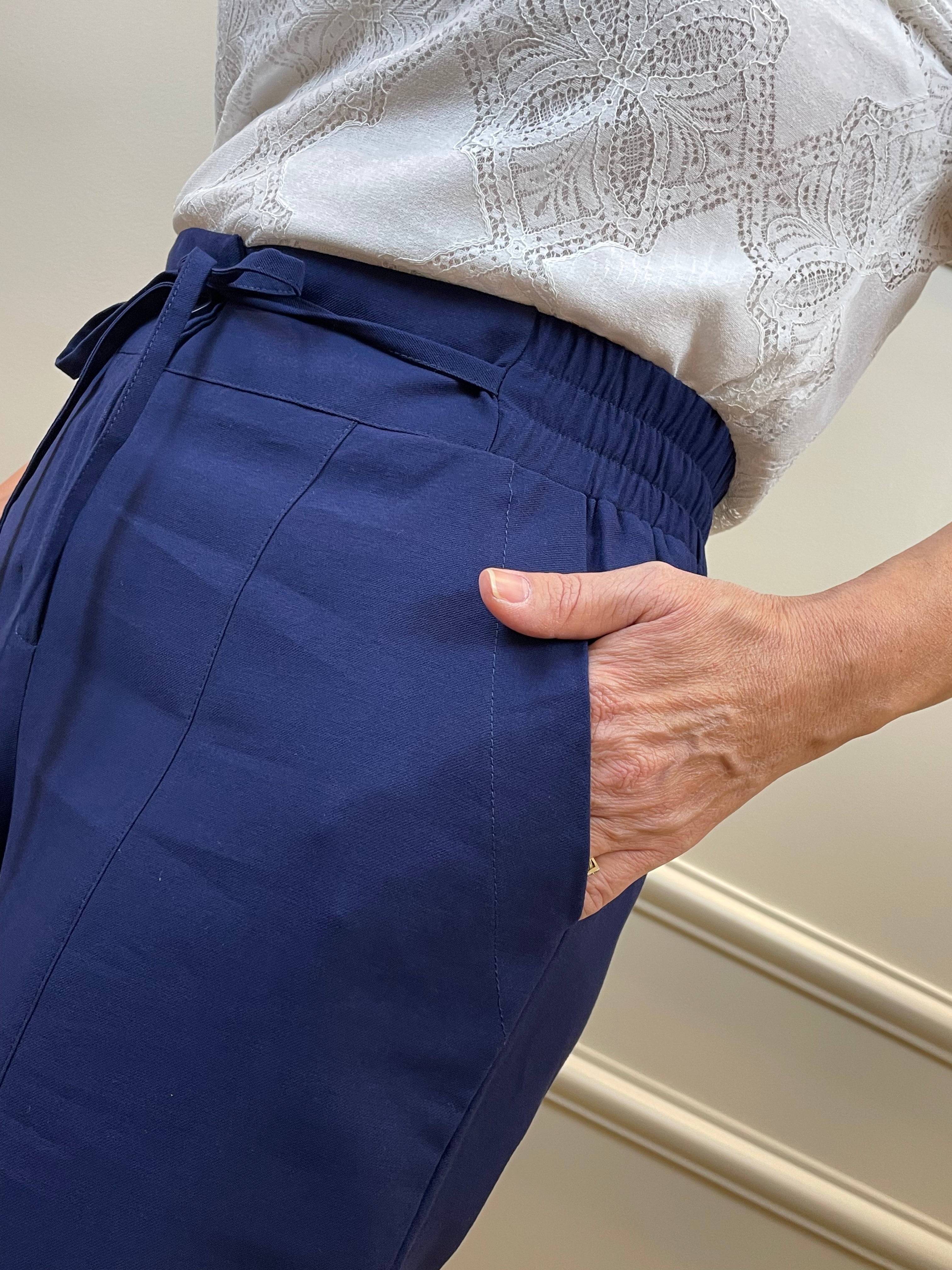A calça da imagem é uma peça de alfaiataria moderna na cor azul-marinho, com modelagem cigarette — levemente afunilada nas pernas e com comprimento na altura do tornozelo. Possui cintura alta, que valoriza a silhueta, e vem com um cinto de amarração do mesmo tecido, que adiciona charme e sofisticação ao look. Os bolsos frontais embutidos trazem funcionalidade sem comprometer o visual elegante. O tecido parece ter bom caimento e leveza, ideal para composições que transitam entre o casual e o formal com muita elegância.