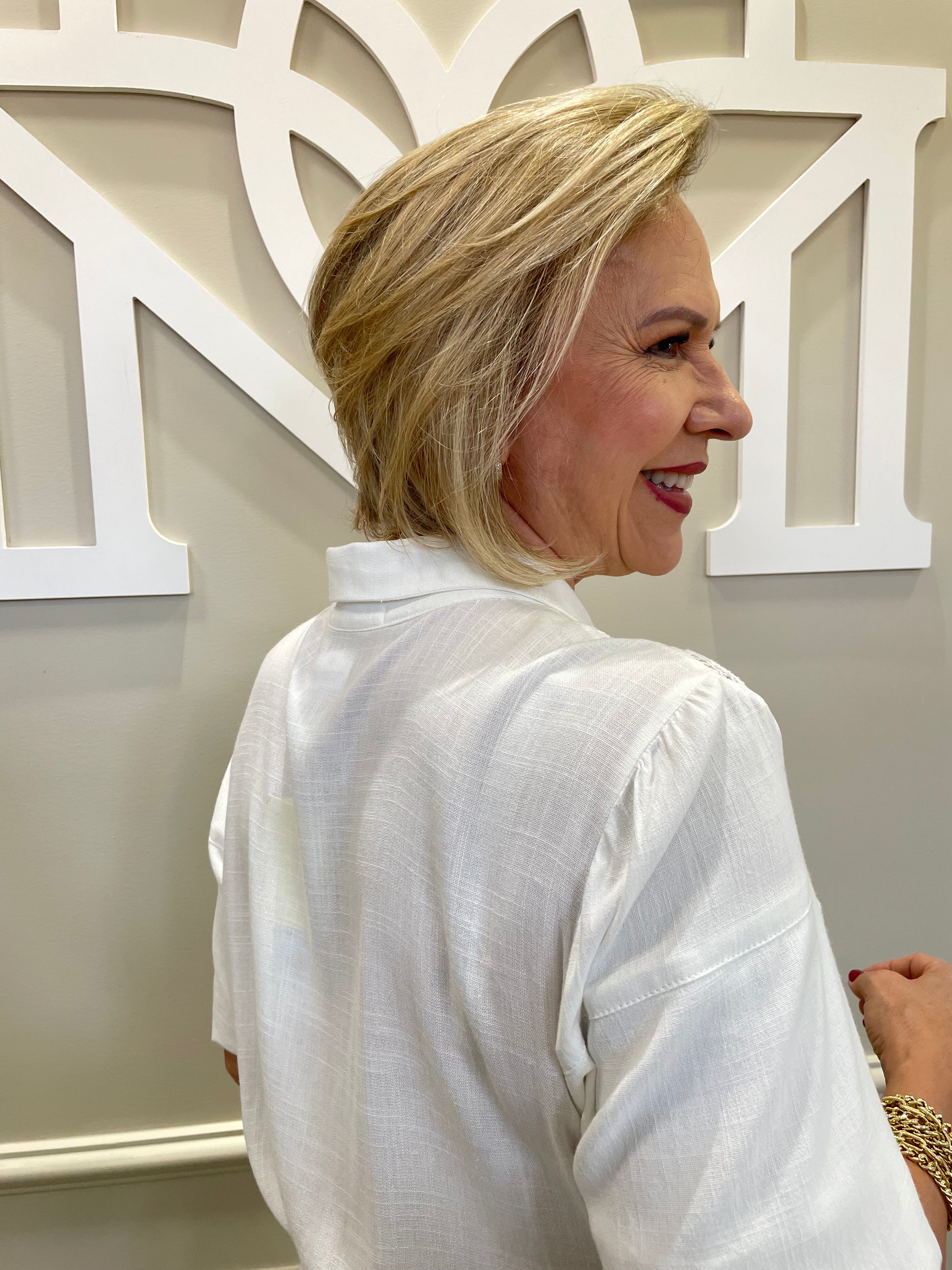 Confeccionada em tecido leve e com excelente caimento, ela se destaca pelo trabalho em renda bordada na parte superior, que adiciona um toque de delicadeza e feminilidade ao visual. O modelo possui gola tradicional, fechamento por botões frontais forrados e mangas curtas, garantindo conforto e elegância em todas as ocasiões Ideal para composições com peças de alfaiataria ou jeans, essa blusa é uma aposta certeira para quem busca um look sofisticado e atemporal.