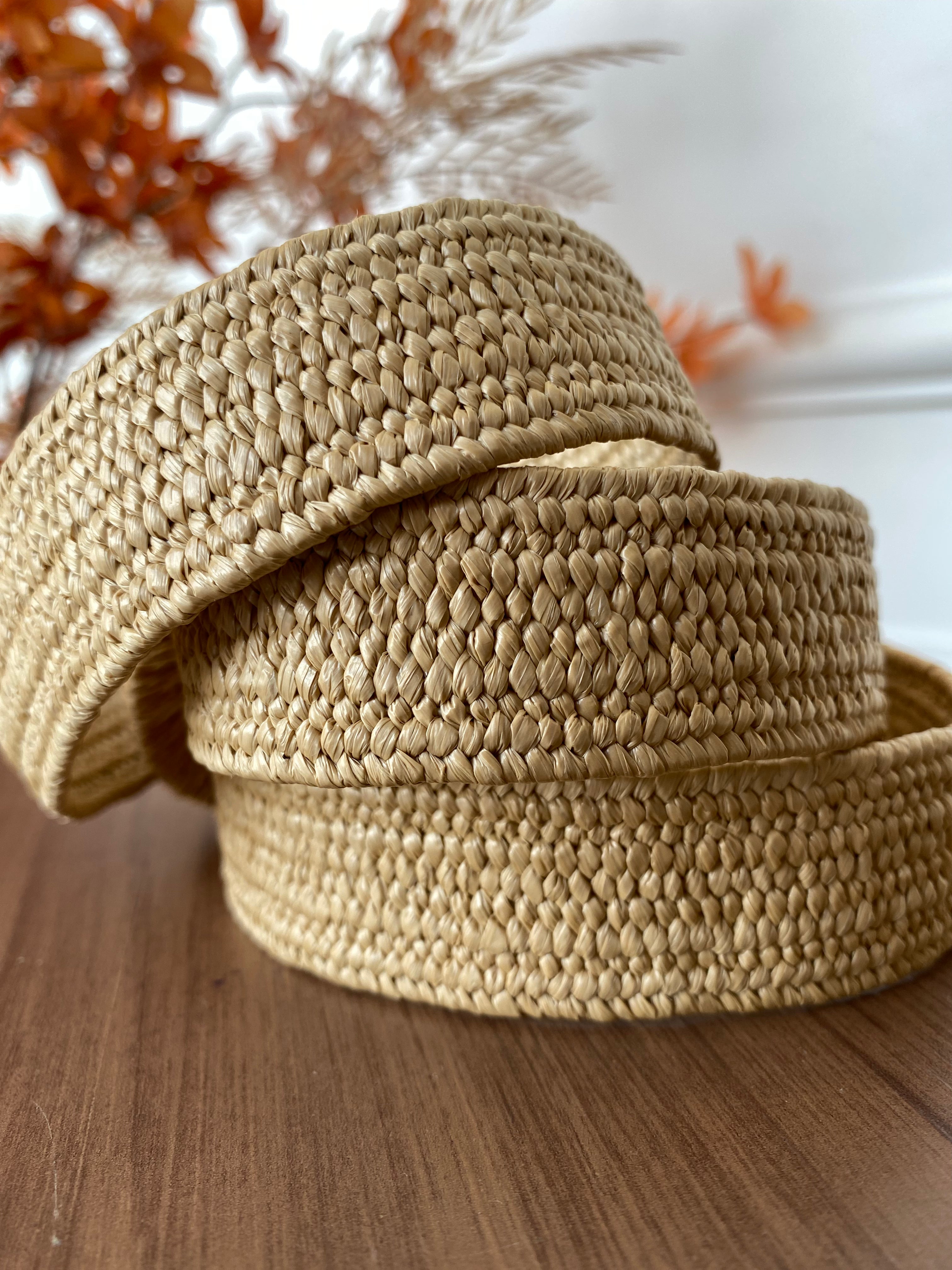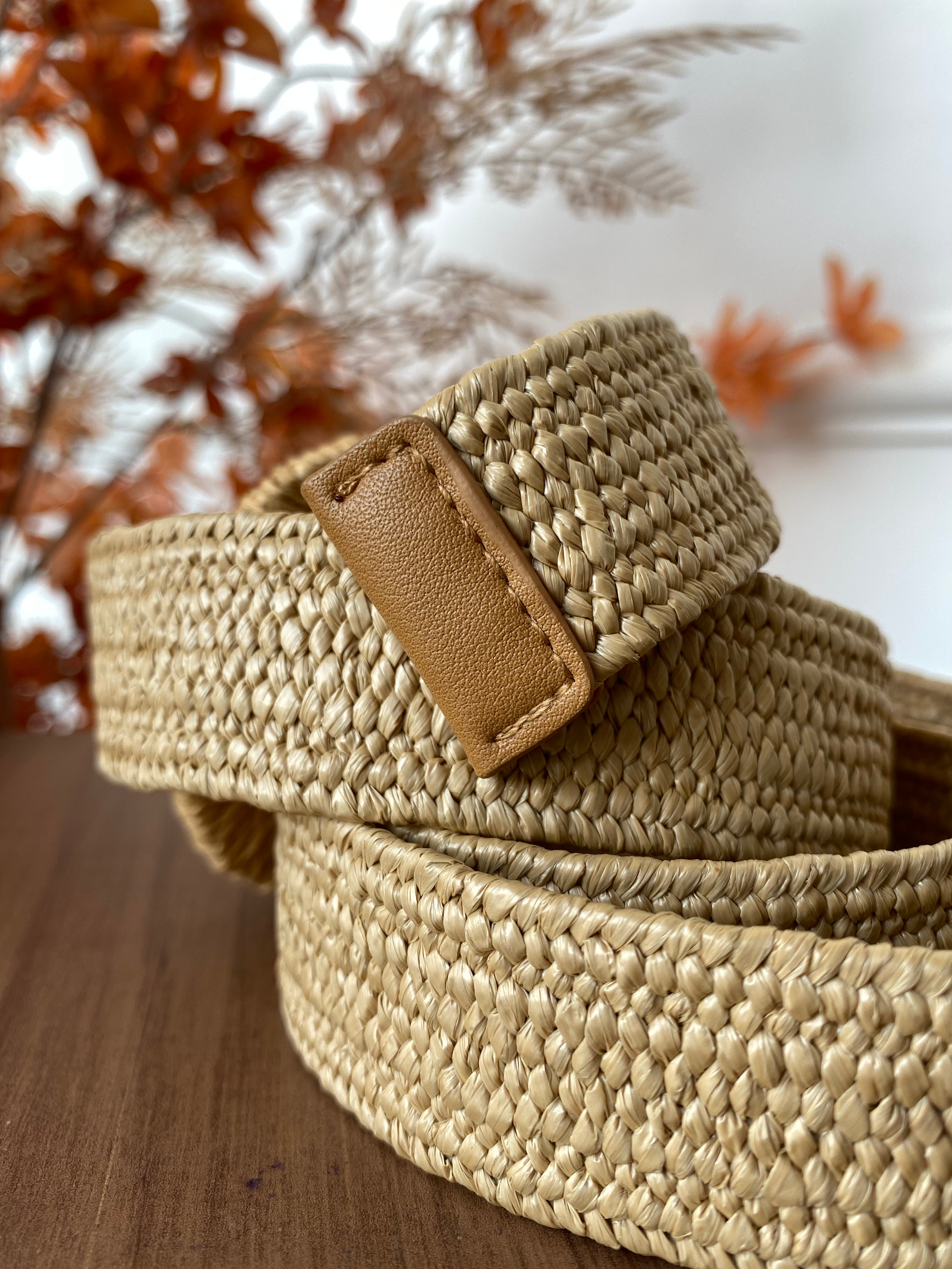 Cinto feminino confeccionado em material trançado com aparência rústica e natural, em tom bege claro/marrom. O design traz uma fivela redonda revestida no mesmo trançado do cinto, criando um visual harmonioso e artesanal. O acabamento é firme e bem estruturado, com textura entrelaçada que valoriza produções casuais e formais. Ideal para compor looks de verão ou com peças em linho, vestidos fluídos e saias de cintura alta. O cinto veste qualquer tamanho, dando para encaixar o fecho do tamanho P ao GG