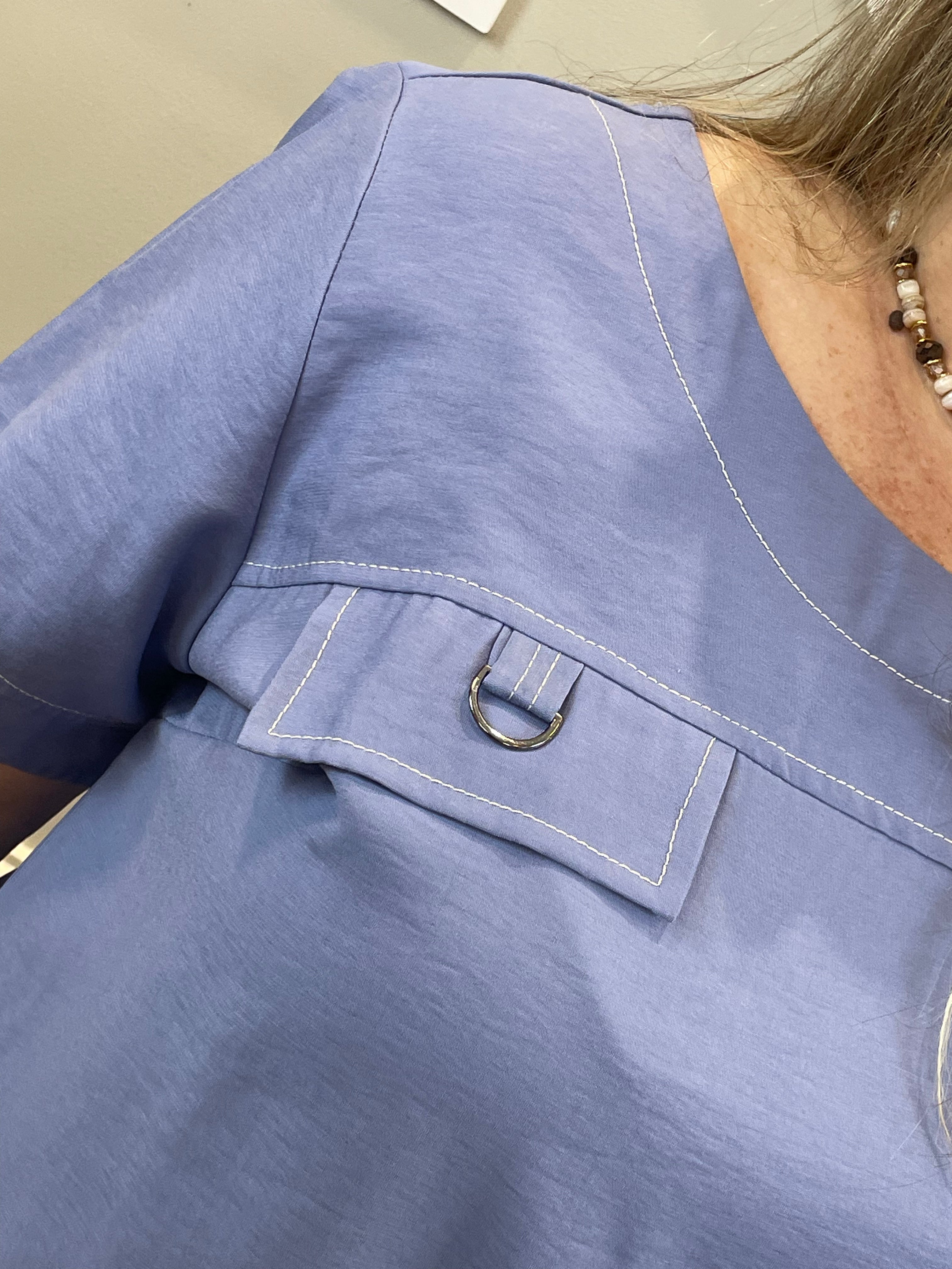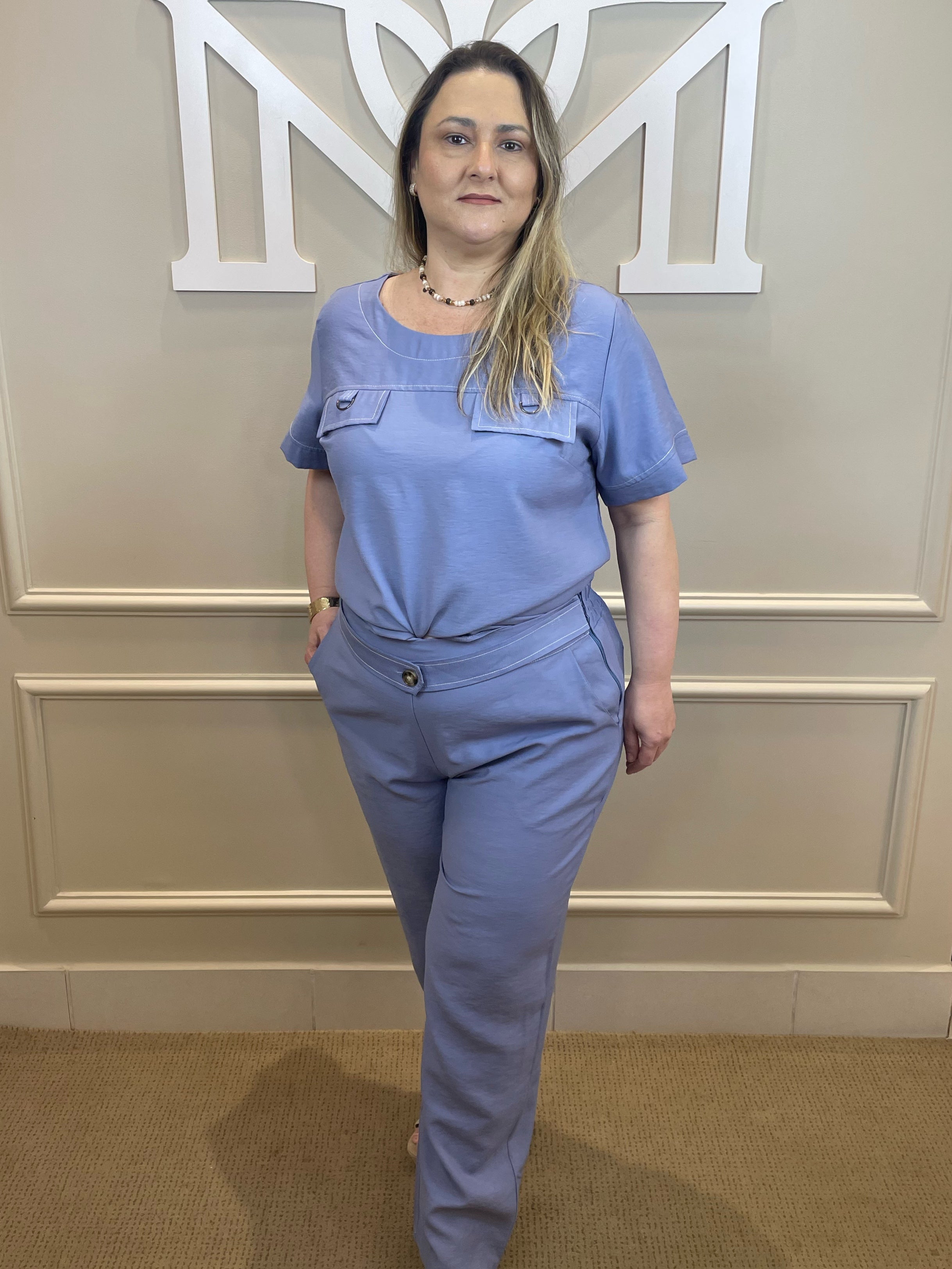 Composto por blusa e calça no tom azul bebê, ele traz um visual moderno e sofisticado, perfeito para quem busca estilo com praticidade.