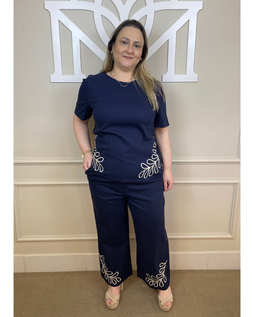 Conjunto calça/blusa linho marinho bordada off - Seiki