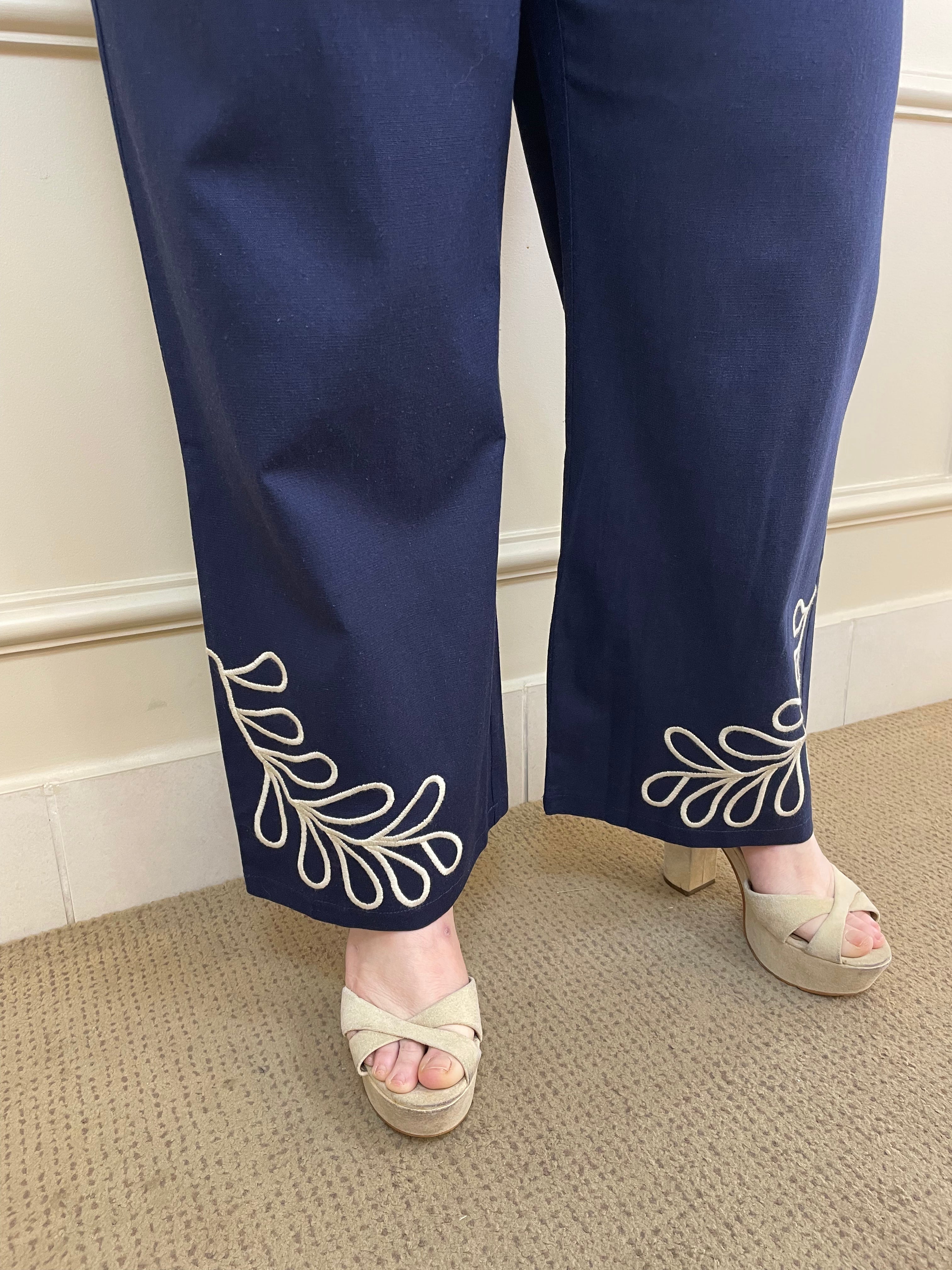 A calça tem corte reto e comprimento na altura do tornozelo, com detalhe bordado em off na região dos bolsos e na barra — formando desenhos delicados em formato de folhagem, que trazem um toque de charme e sofisticação ao look.
