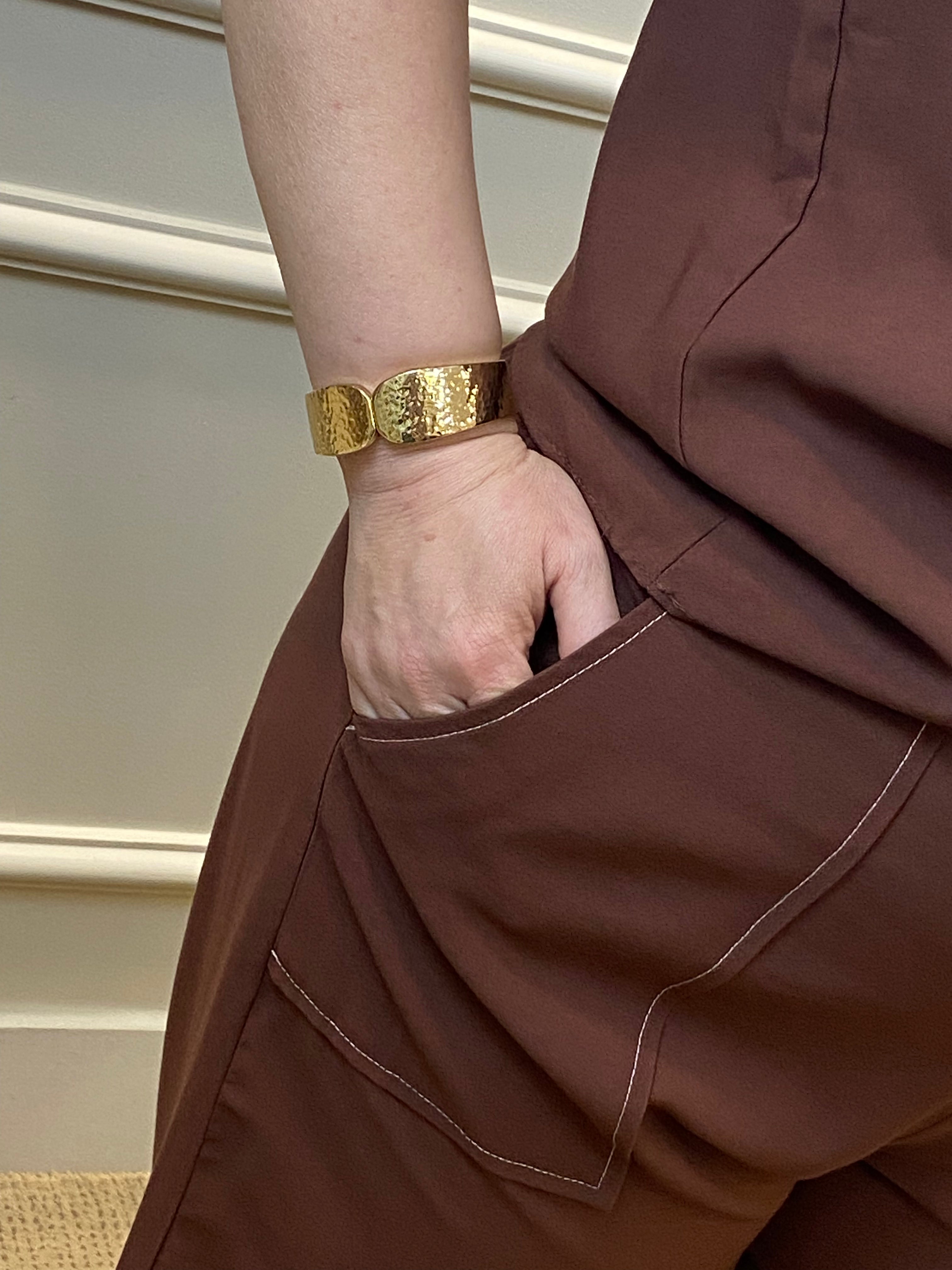 O tom marrom terroso transmite sofisticação e naturalidade, ideal para produções versáteis que transitam do trabalho a eventos casuais.