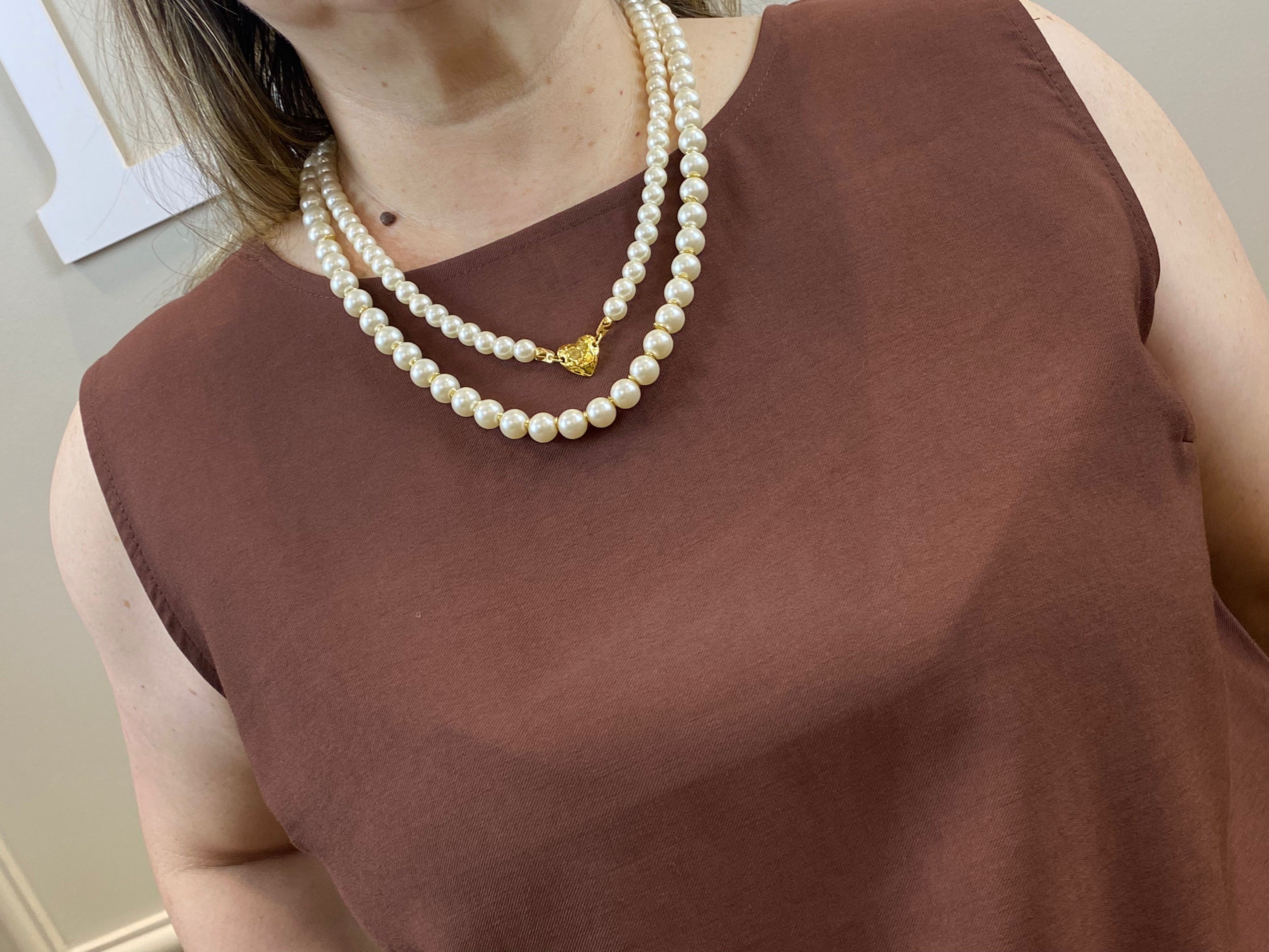 O look é finalizado com acessórios clássicos, como o colar de pérolas e sapatos em tom neutro, realçando a elegância discreta da produção.