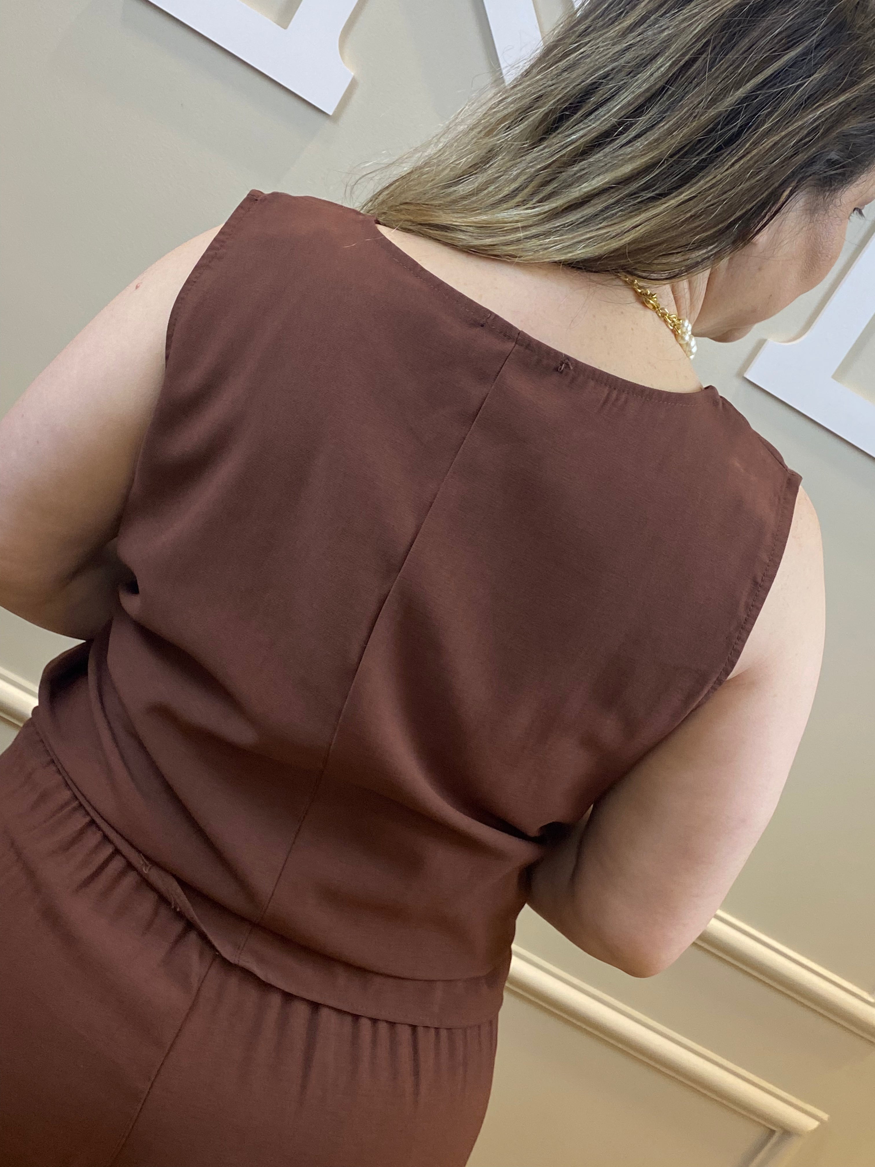Ele é composto por uma blusa sem mangas com modelagem reta e acabamento limpo, e uma calça pantalona cropped com recortes e bolsos frontais que adicionam um toque moderno ao visual.