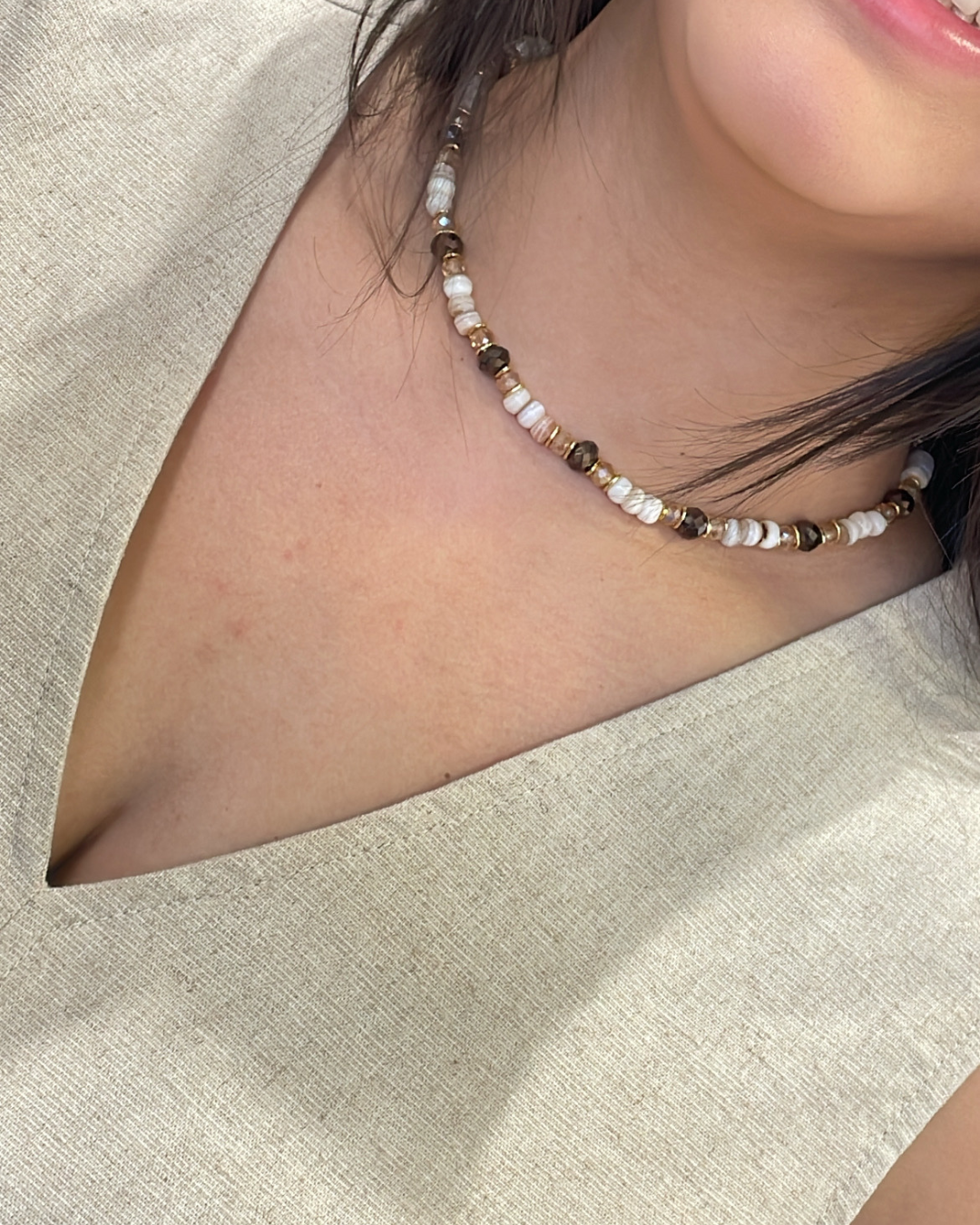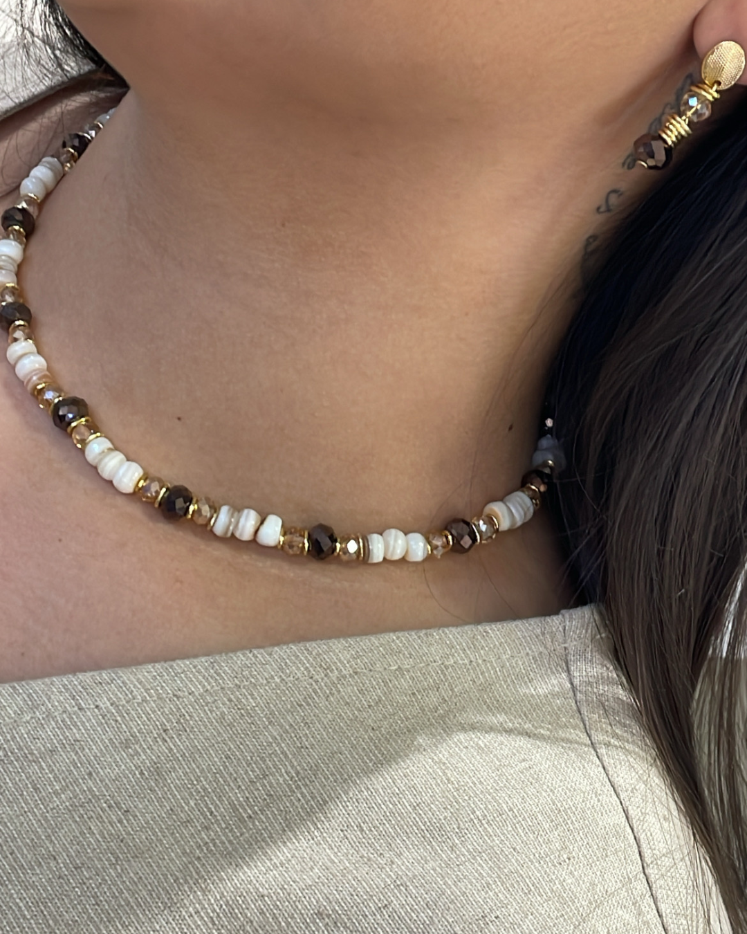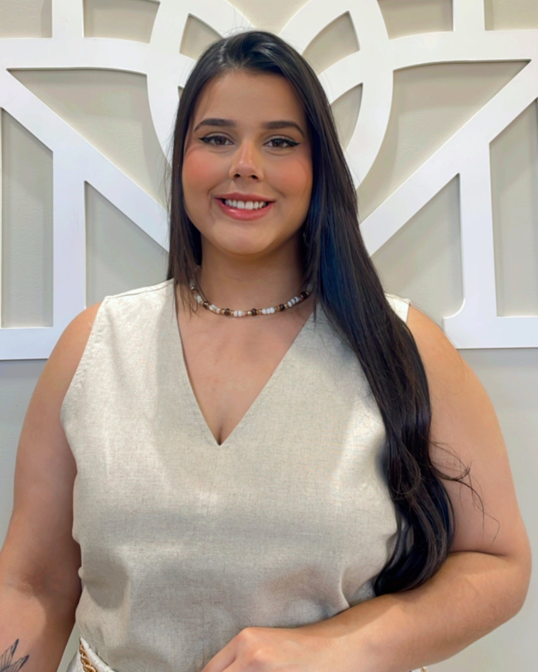 É uma blusa atemporal, em tom neutro claro, que facilita combinações e se adapta a diferentes estilos e ocasiões.