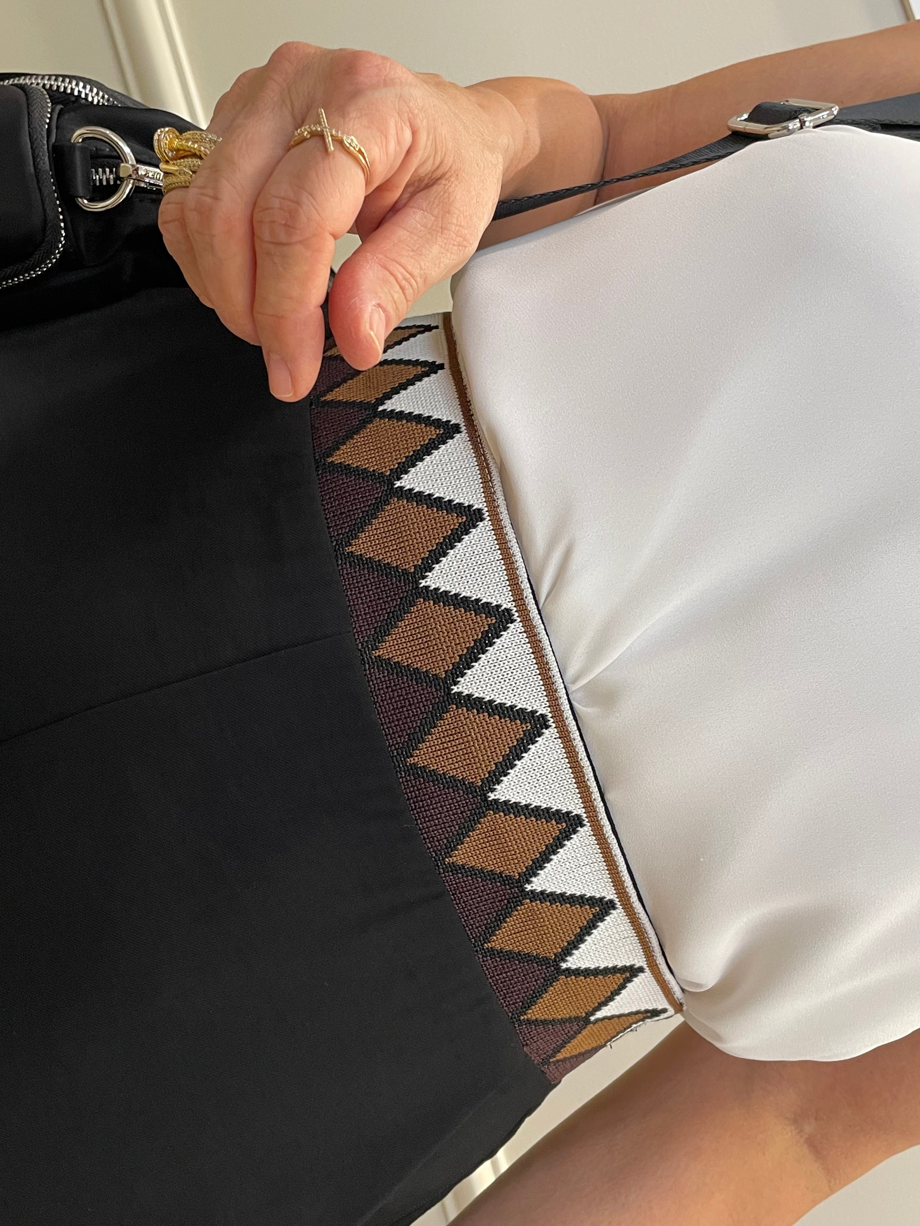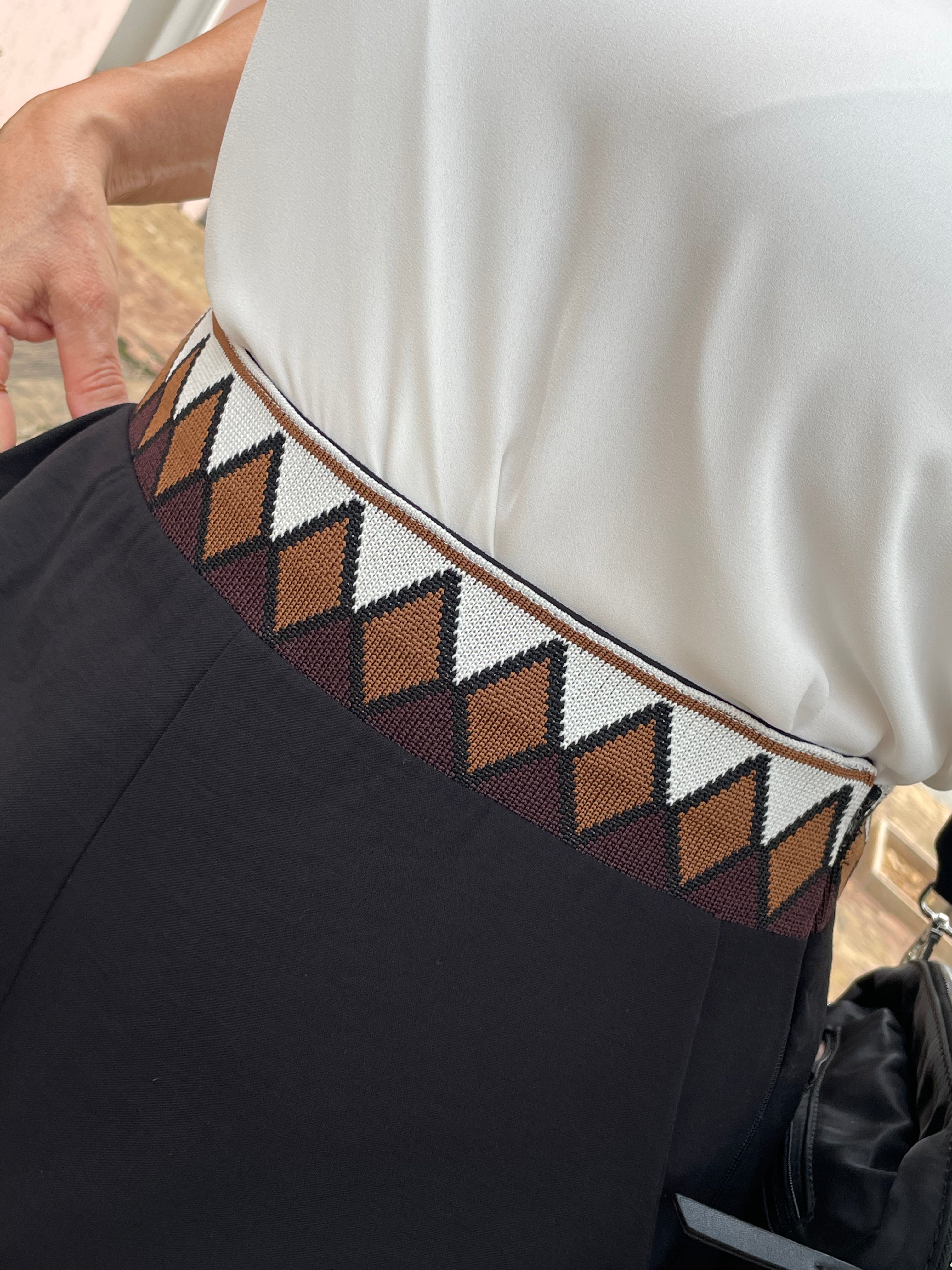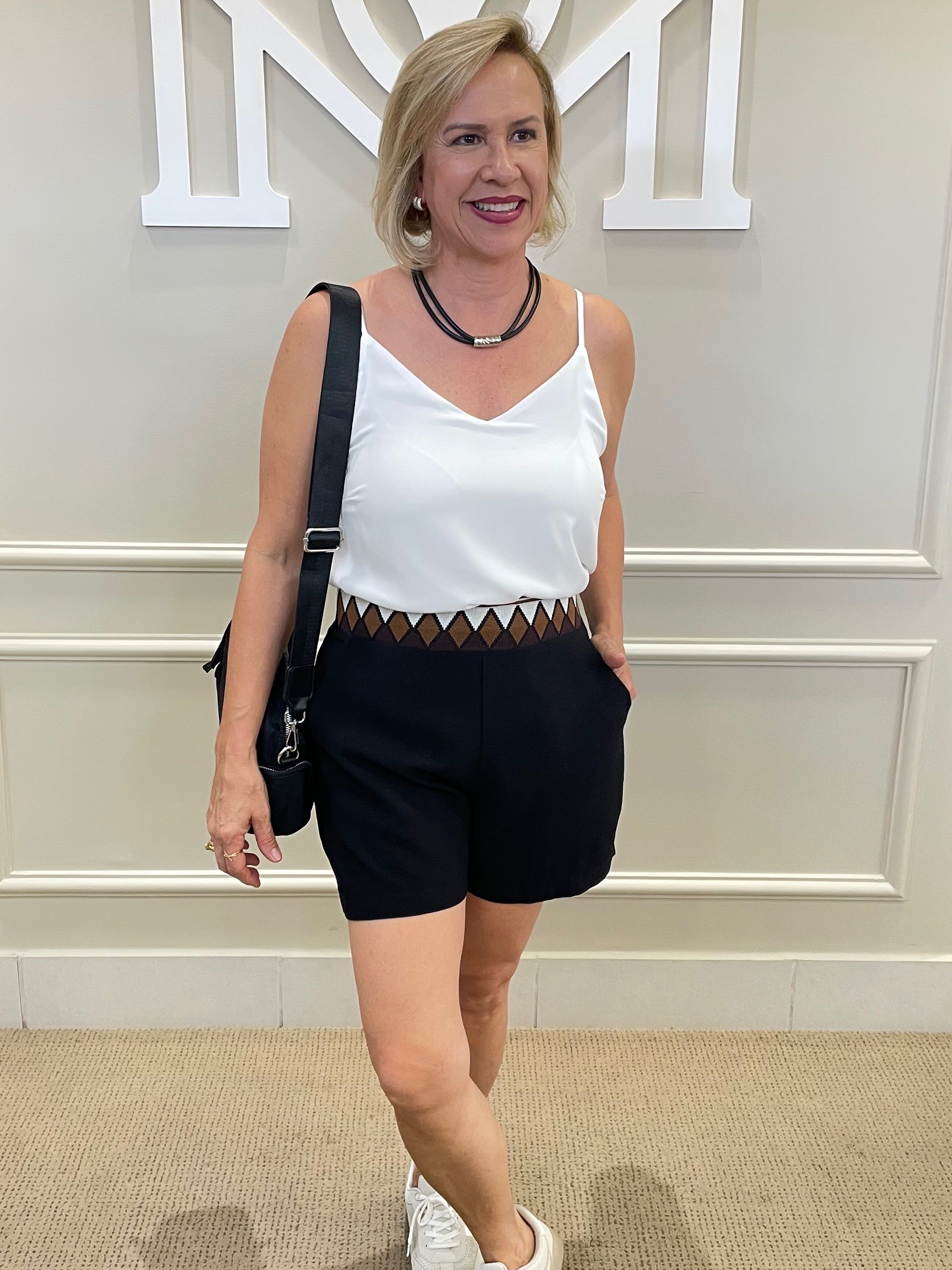 Short de alfaiataria em tecido encorpado, com modelagem reta e cintura alta. O destaque fica por conta do cós bordado em padrão geométrico nas cores caramelo, branco e preto, que traz um toque artesanal e moderno à peça. Possui caimento impecável, valorizando a silhueta com elegância e conforto. Ideal para composições sofisticadas e casuais, combinando perfeitamente com blusas leves, regatas ou camisas em tons neutros.