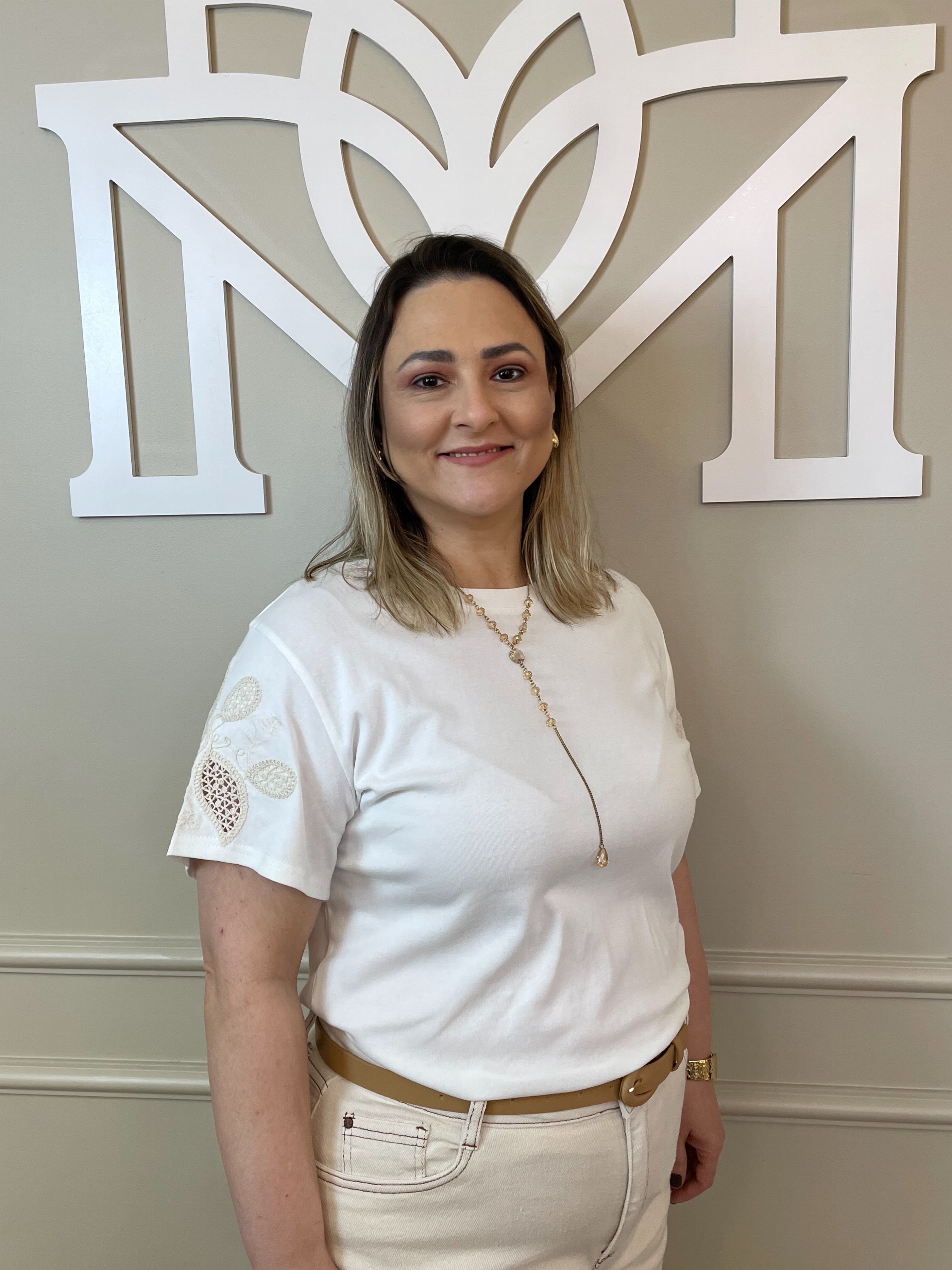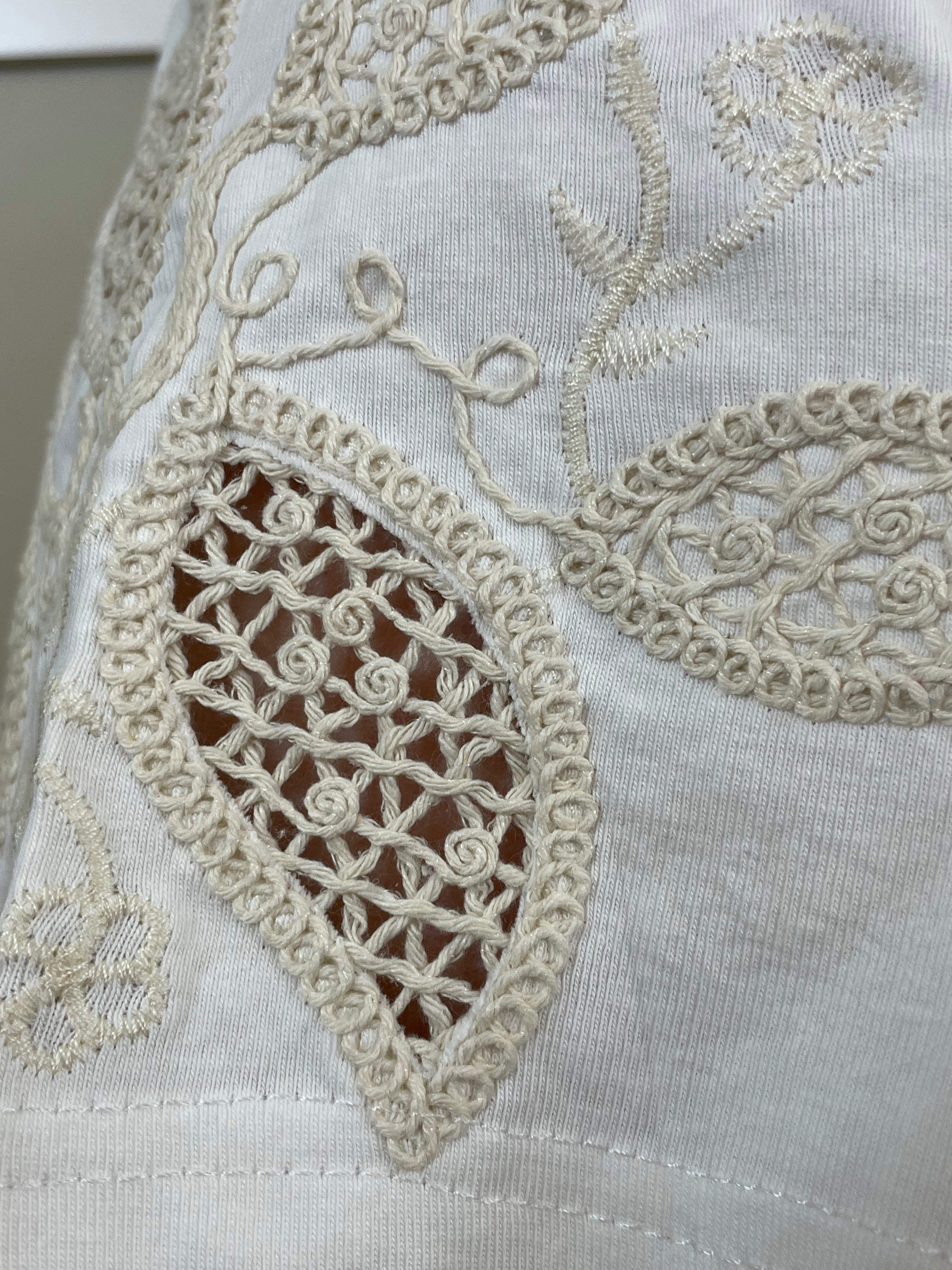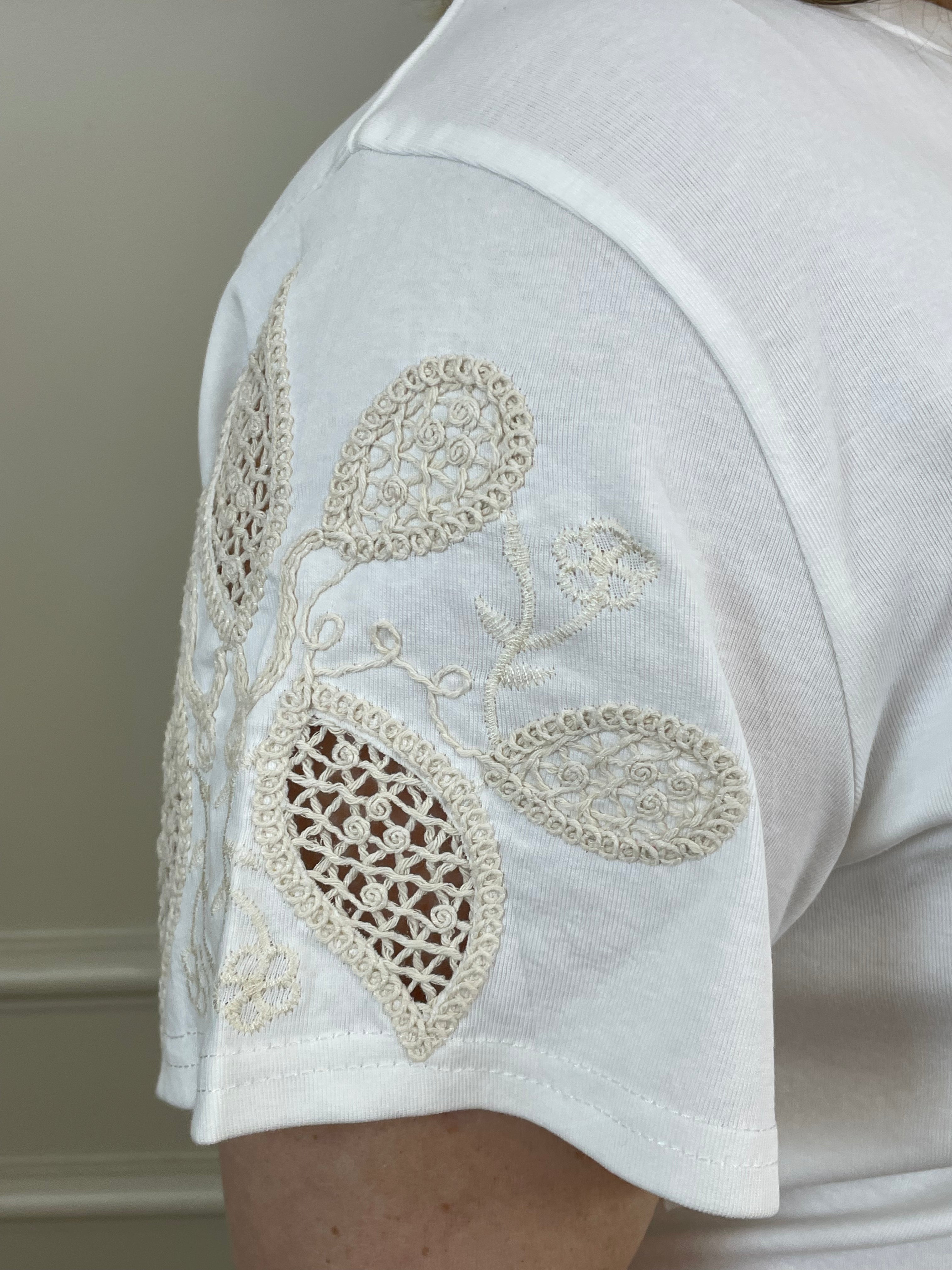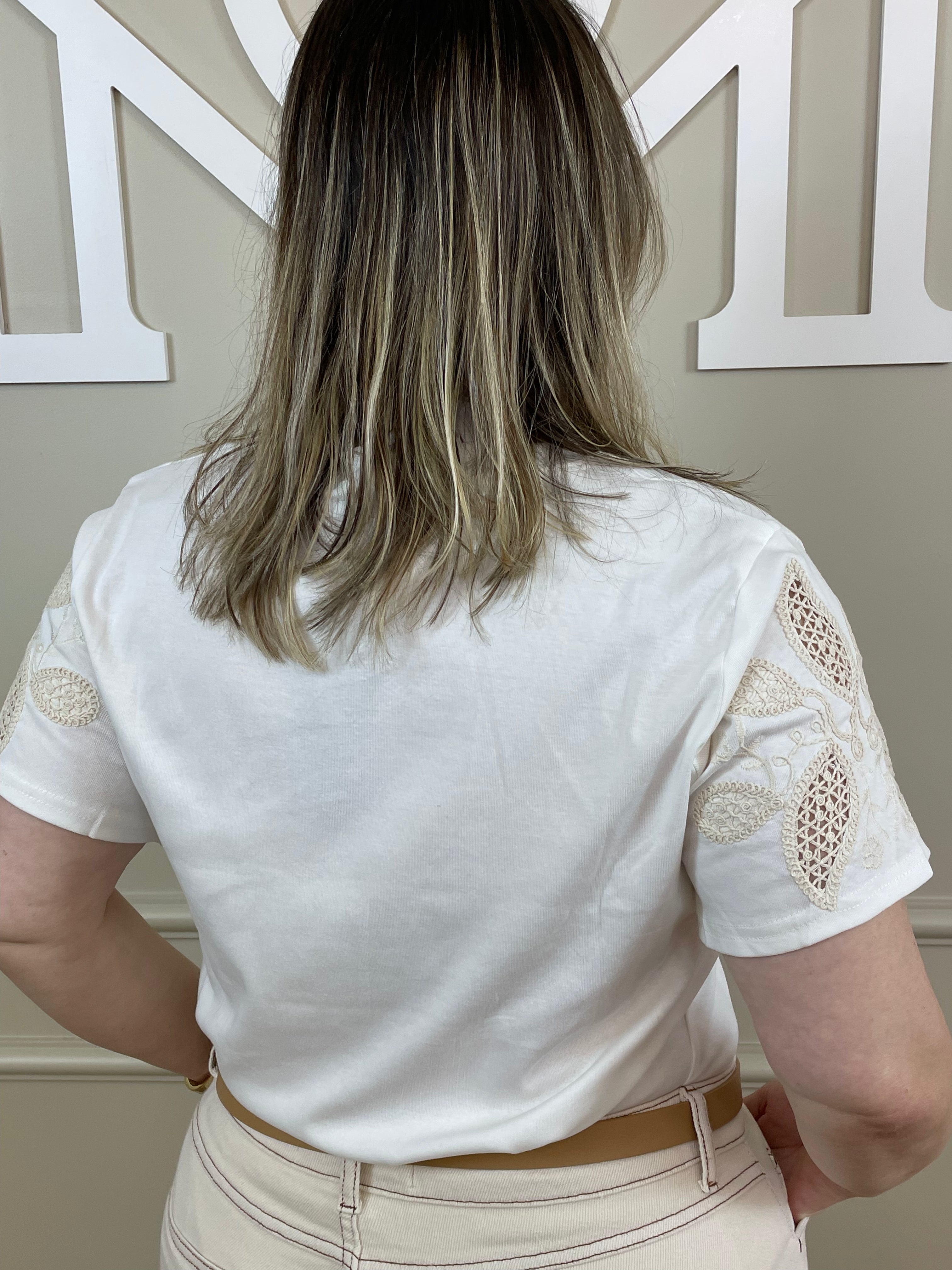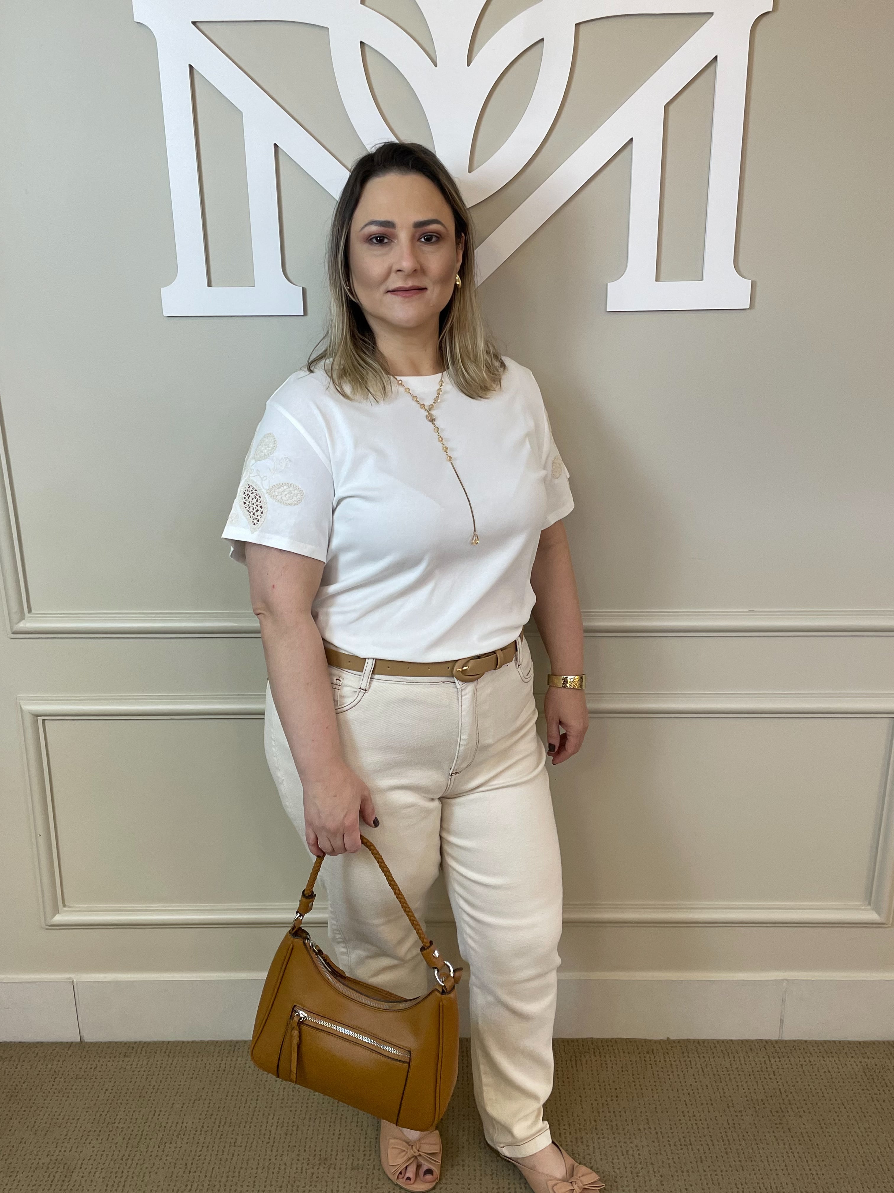 Blusa feminina em tom off-white, confeccionada em tecido de malha leve e confortável. Possui modelagem reta com mangas curtas e gola redonda. O destaque fica por conta dos detalhes em bordado vazado nas mangas, que acrescentam um toque delicado e sofisticado à peça. Ideal para compor looks elegantes e casuais, podendo ser combinada com calças, saias ou bermudas em tons neutros.