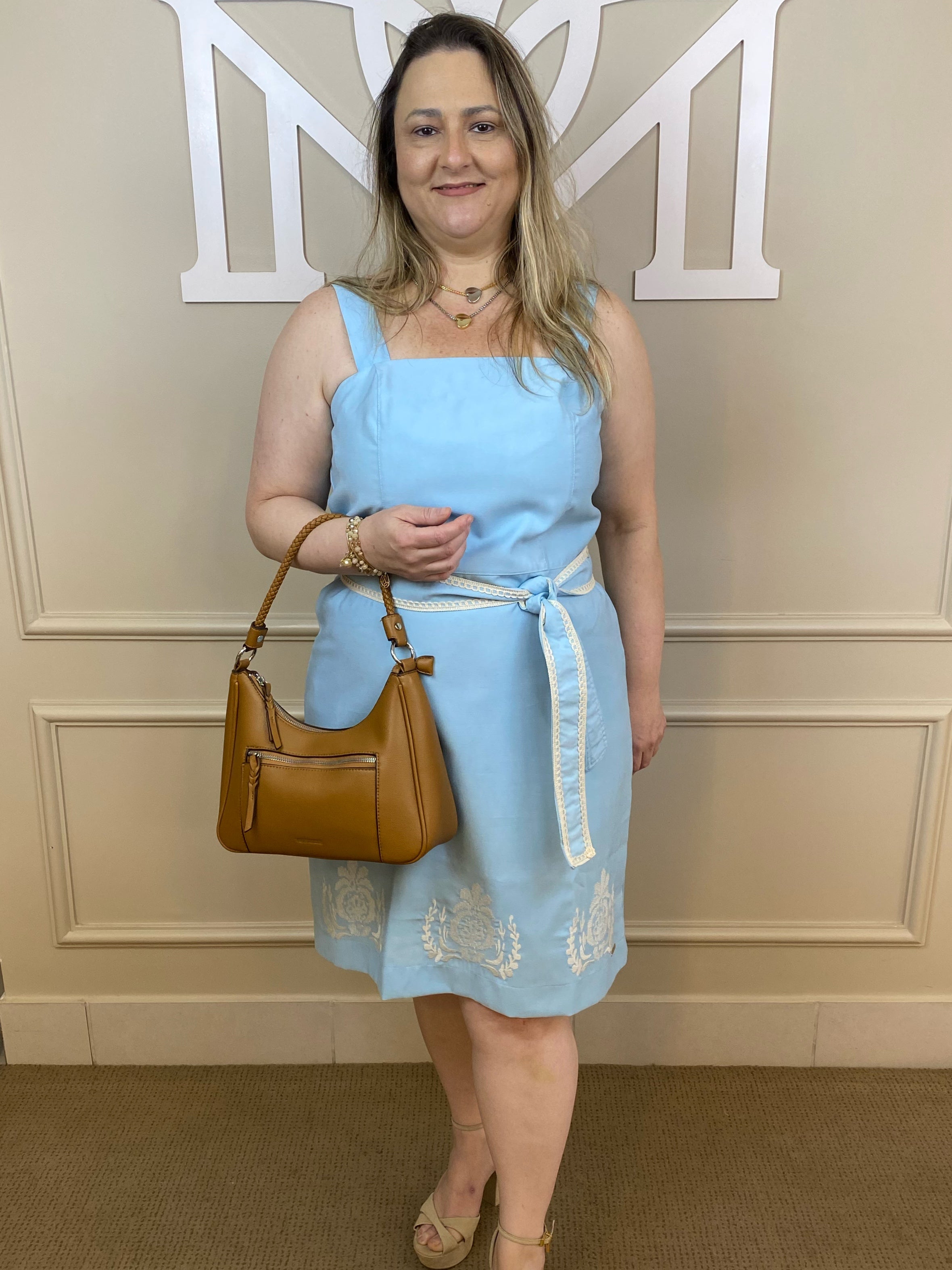 Esse vestido em tom azul bebê transmite uma elegância leve e feminina, perfeita para dias de calor. Ele possui alças largas e decote quadrado, que valorizam o colo com sutileza. A modelagem reta e soltinha garante conforto, enquanto o cinto com amarração na cintura adiciona charme e definição à silhueta. O destaque fica por conta dos bordados delicados na barra, que trazem um toque artesanal e sofisticado ao visual. Uma peça ideal para ocasiões diurnas, combinando muito bem com sandálias de salto ou rasteiras.