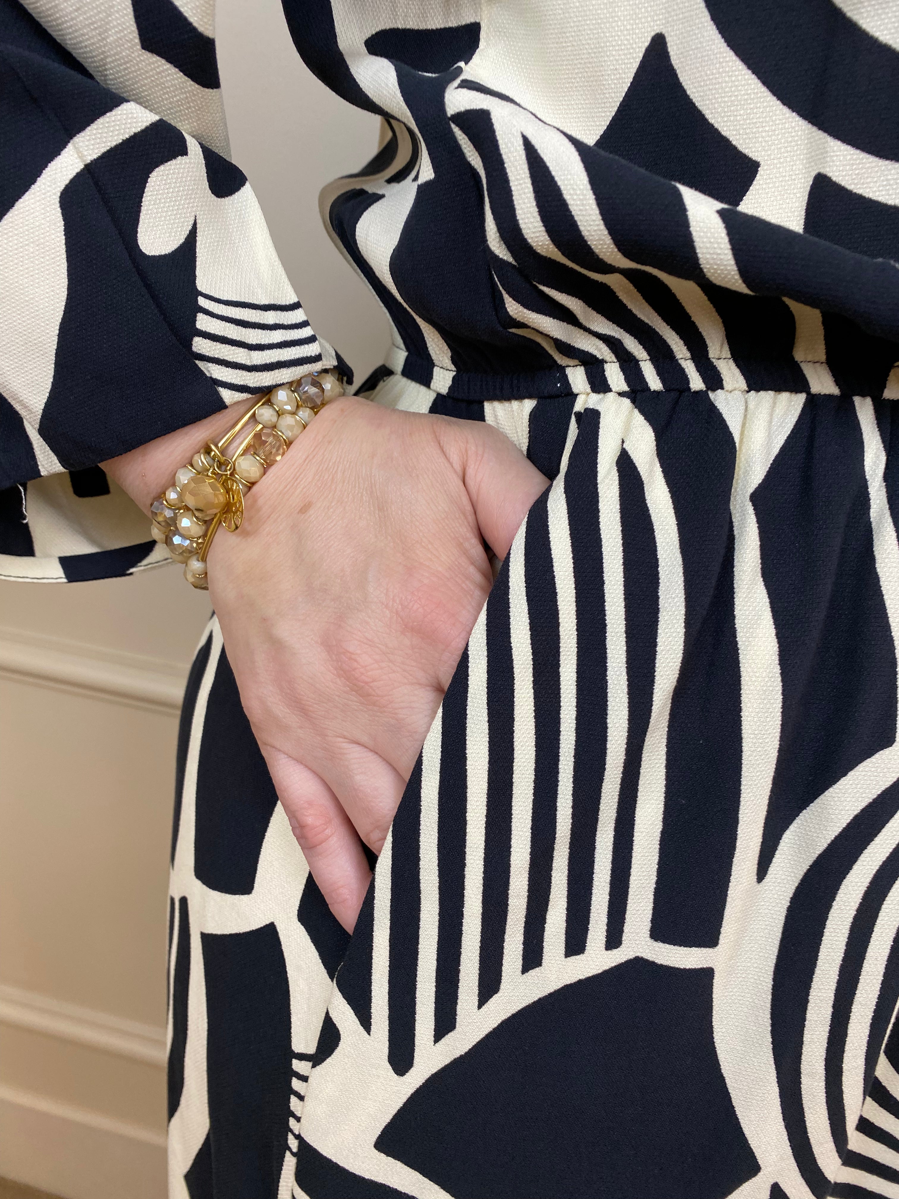 Esse vestido traz uma proposta sofisticada e moderna, perfeita para quem busca elegância com conforto. Ele possui modelagem fluida e comprimento midi, valorizando o movimento e o caimento do tecido. A estampa abstrata em preto e off-white cria um visual contemporâneo e atemporal, ideal para diversas ocasiões. O decote com amarração delicada e as mangas longas com volume leve adicionam um toque feminino e refinado à produção. Um look que transita facilmente do trabalho a um jantar especial, mantendo sempre um ar de sofisticação discreta.