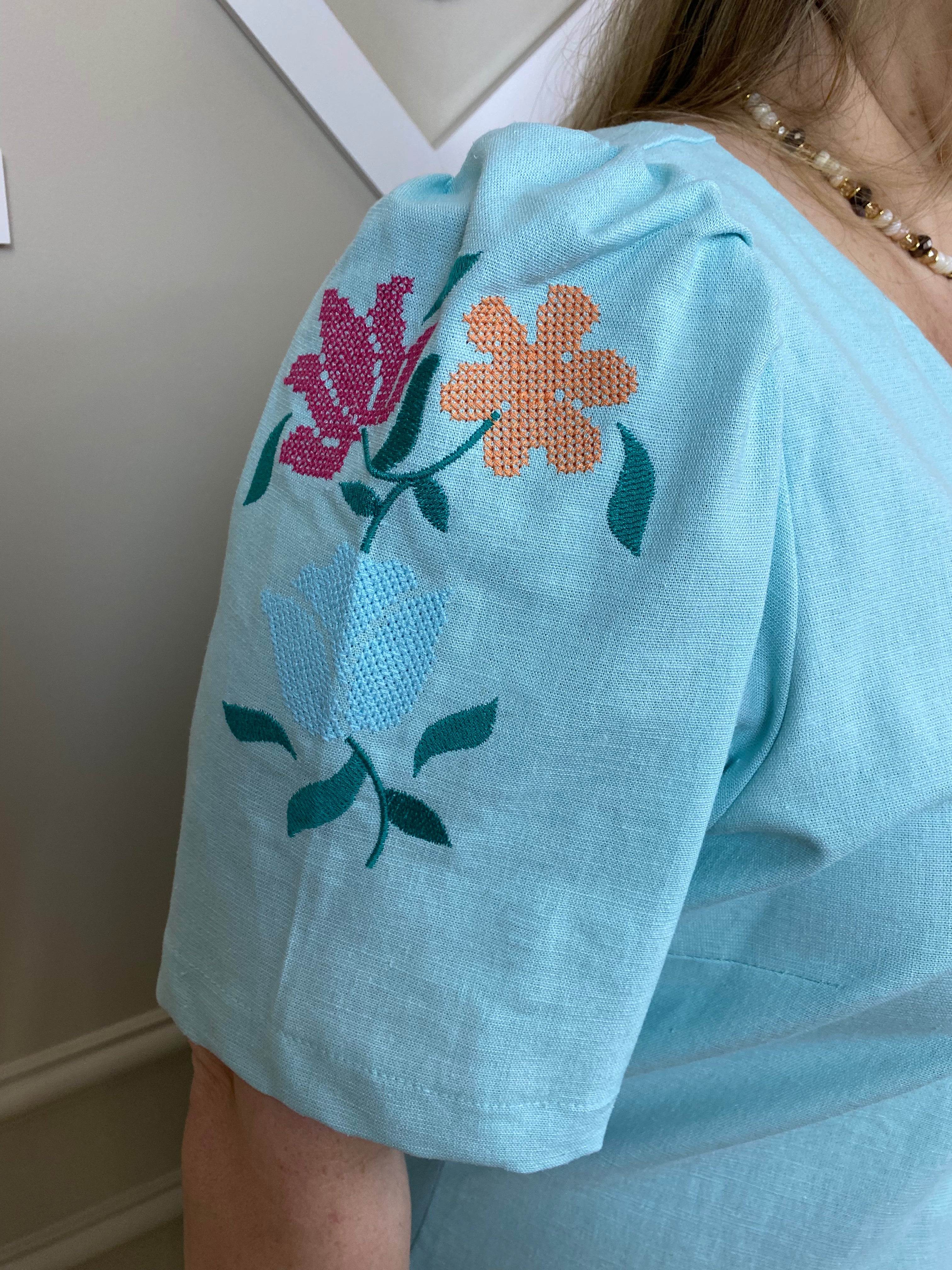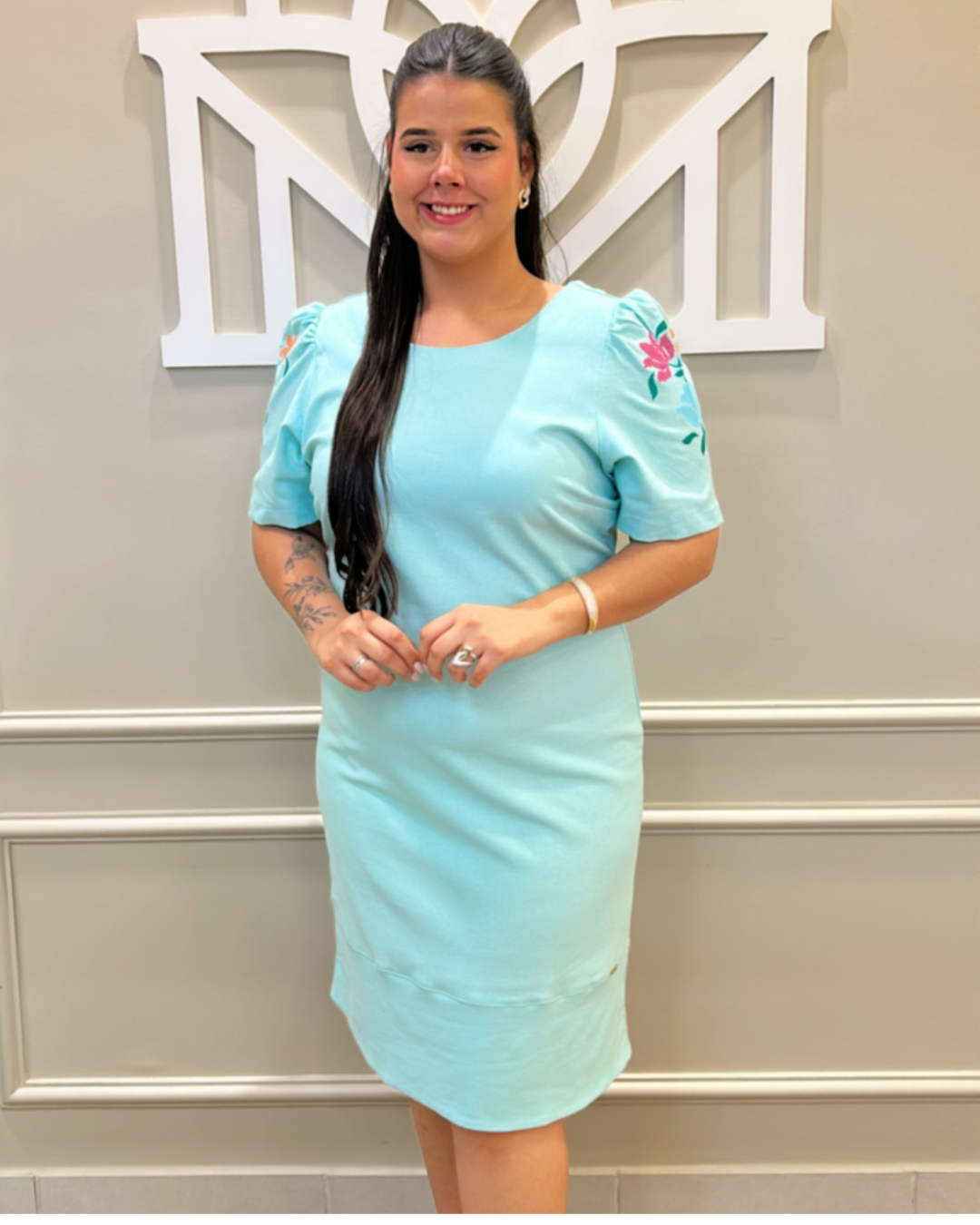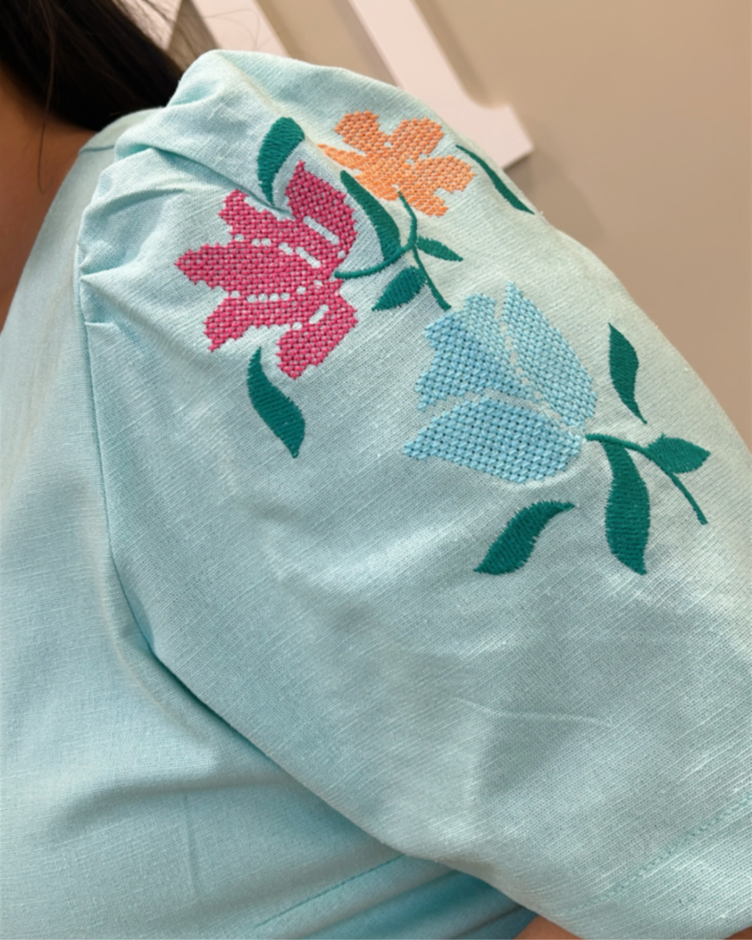 • Detalhes bordados florais nos ombros, em tons de rosa e verde, trazendo feminilidade e charme especial.