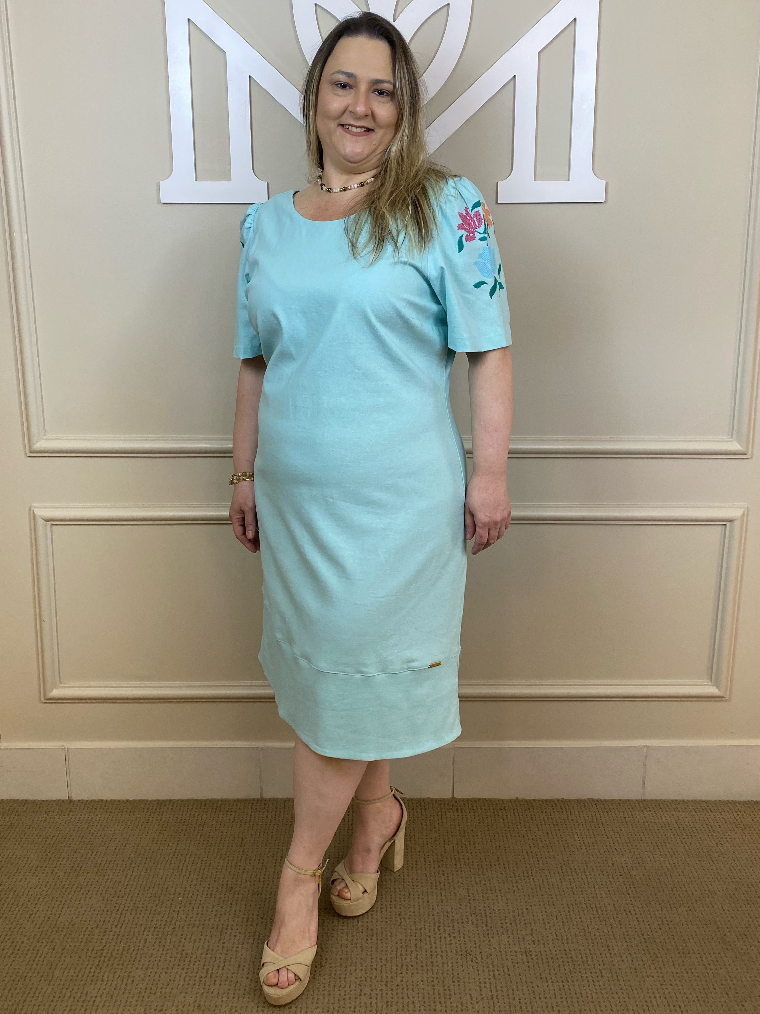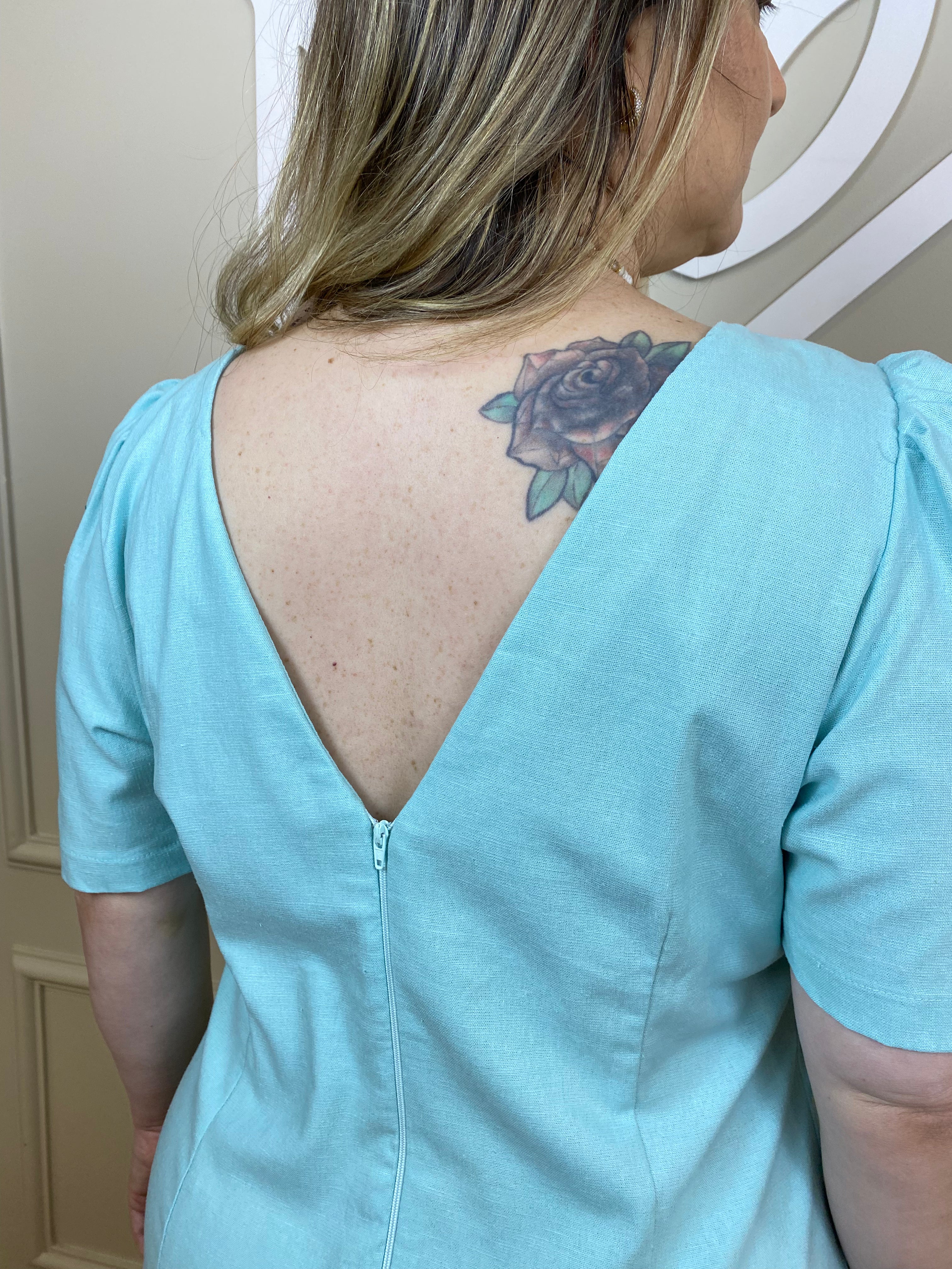 O vestido da imagem é um modelo tubinho na cor azul bebê que une delicadeza e sofisticação. Ele possui: