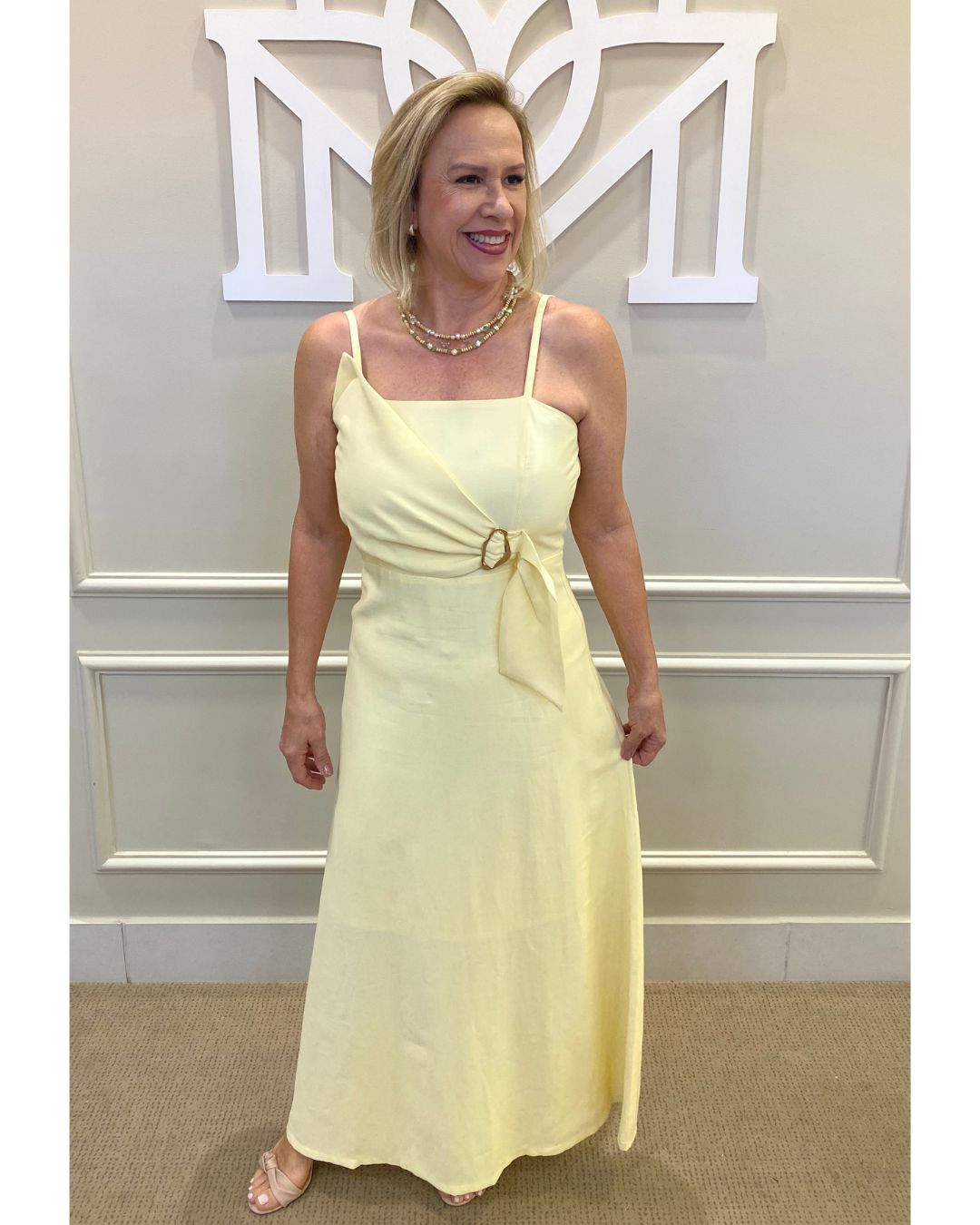 O vestido da imagem é longo e confeccionado em um tecido leve de tom amarelo-claro, transmitindo um ar delicado e elegante. Ele possui alças finas e um decote reto, valorizando o colo de forma sutil. Na região da cintura, há um detalhe de amarração lateral com um anel decorativo que cria um leve drapeado, destacando a silhueta de maneira sofisticada. O caimento é solto e fluido, proporcionando movimento e conforto. Perfeito para ocasiões diurnas ou eventos ao ar livre.
