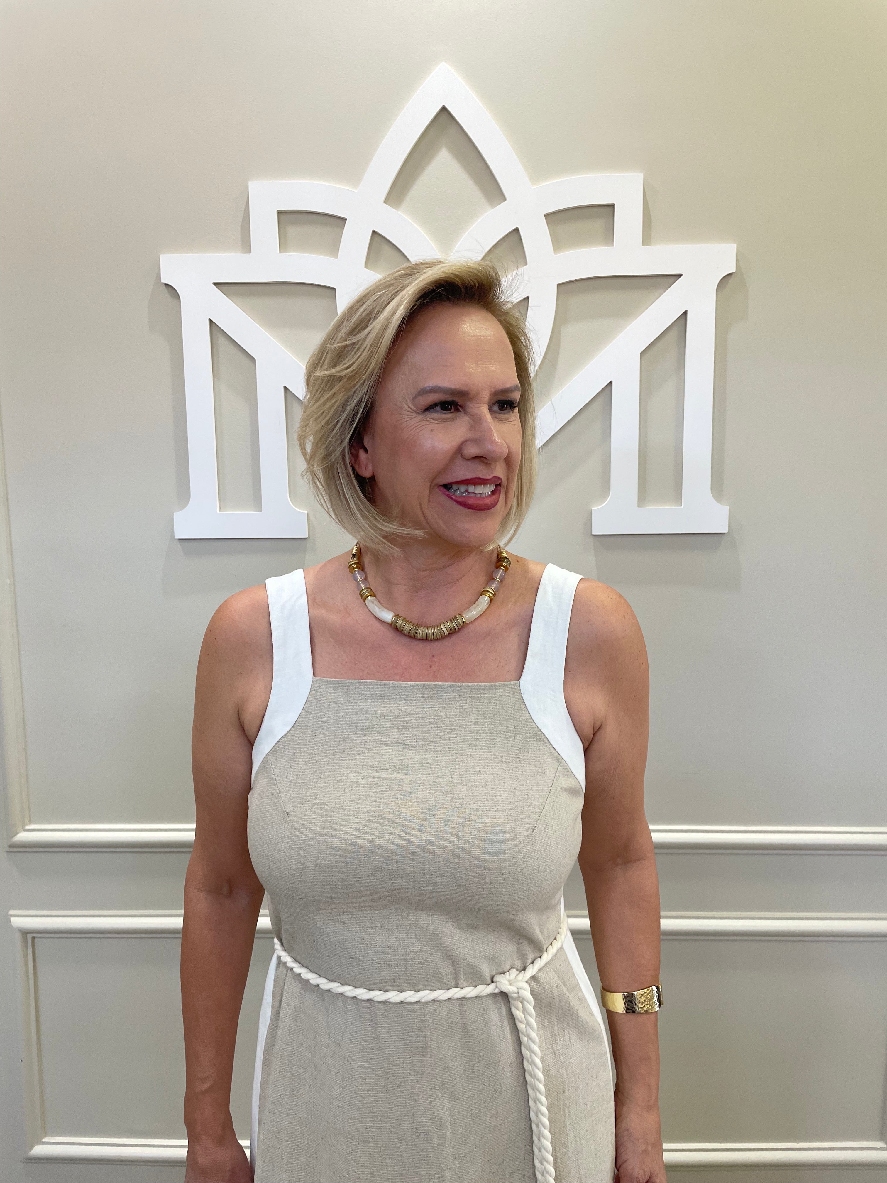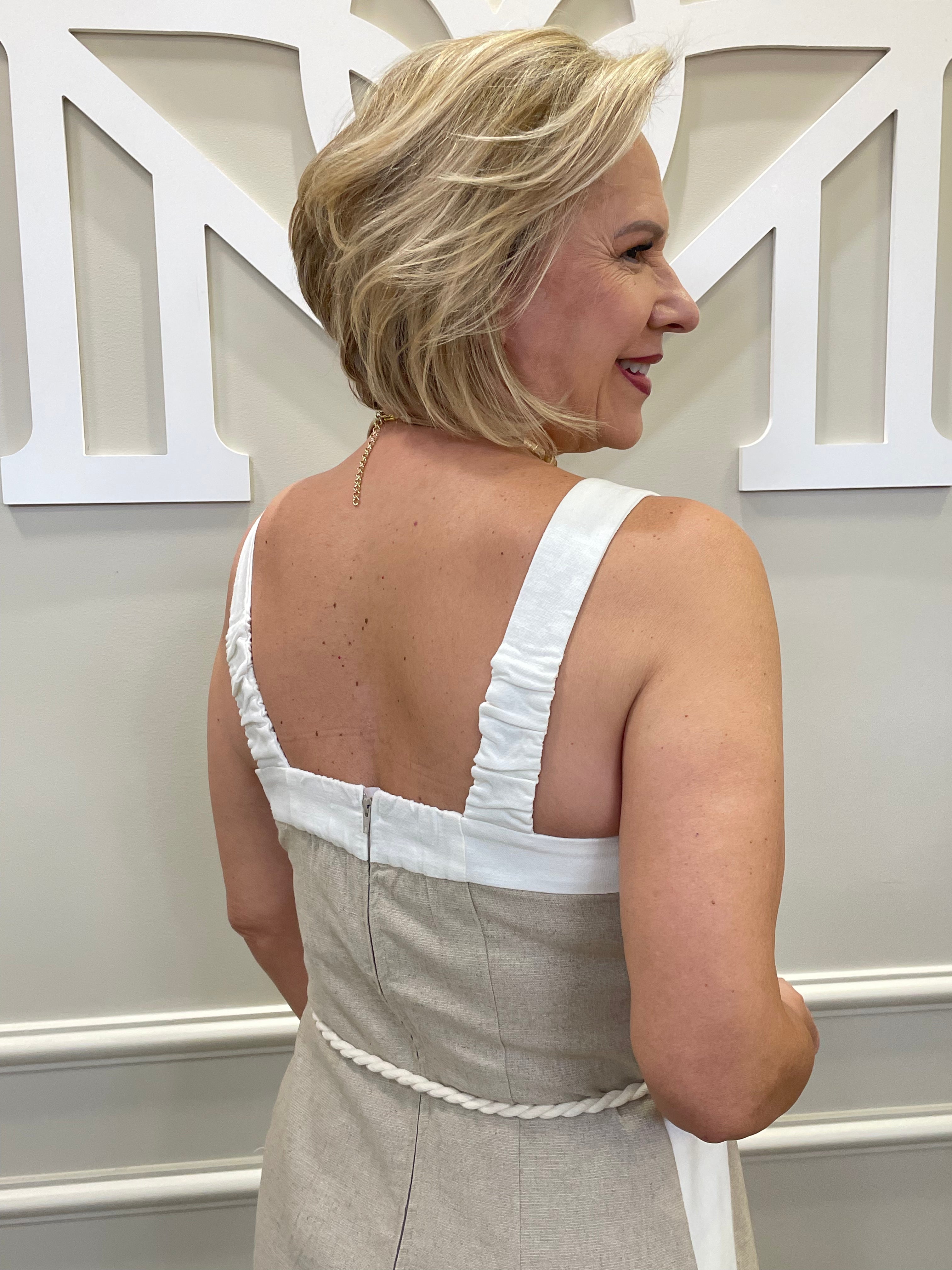 Vestido longo de modelagem reta, confeccionado em tecido leve com aparência natural, em tom bege com detalhes brancos nas laterais e nas alças largas, que valorizam a silhueta e criam um visual moderno e elegante. A peça conta com decote reto e cintura marcada por um cordão trançado em tom claro, que adiciona um toque rústico e ao mesmo tempo sofisticado ao look. Com fenda lateral discreta e caimento fluido, é ideal para composições leves e refinadas em dias mais quentes. Um modelo versátil que transita com facilidade entre ocasiões casuais e eventos mais arrumados.