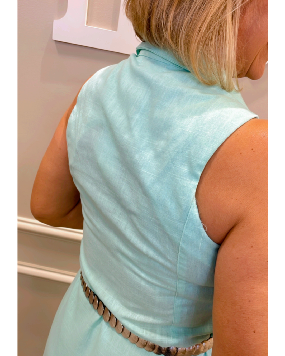 Vestido midi verde-claro, de modelagem elegante e sofisticada. A peça tem alças largas, decote quadrado e recortes estruturados que valorizam a silhueta. O vestido possui caimento leve e comprimento abaixo dos joelhos, conferindo um visual clássico e refinado.