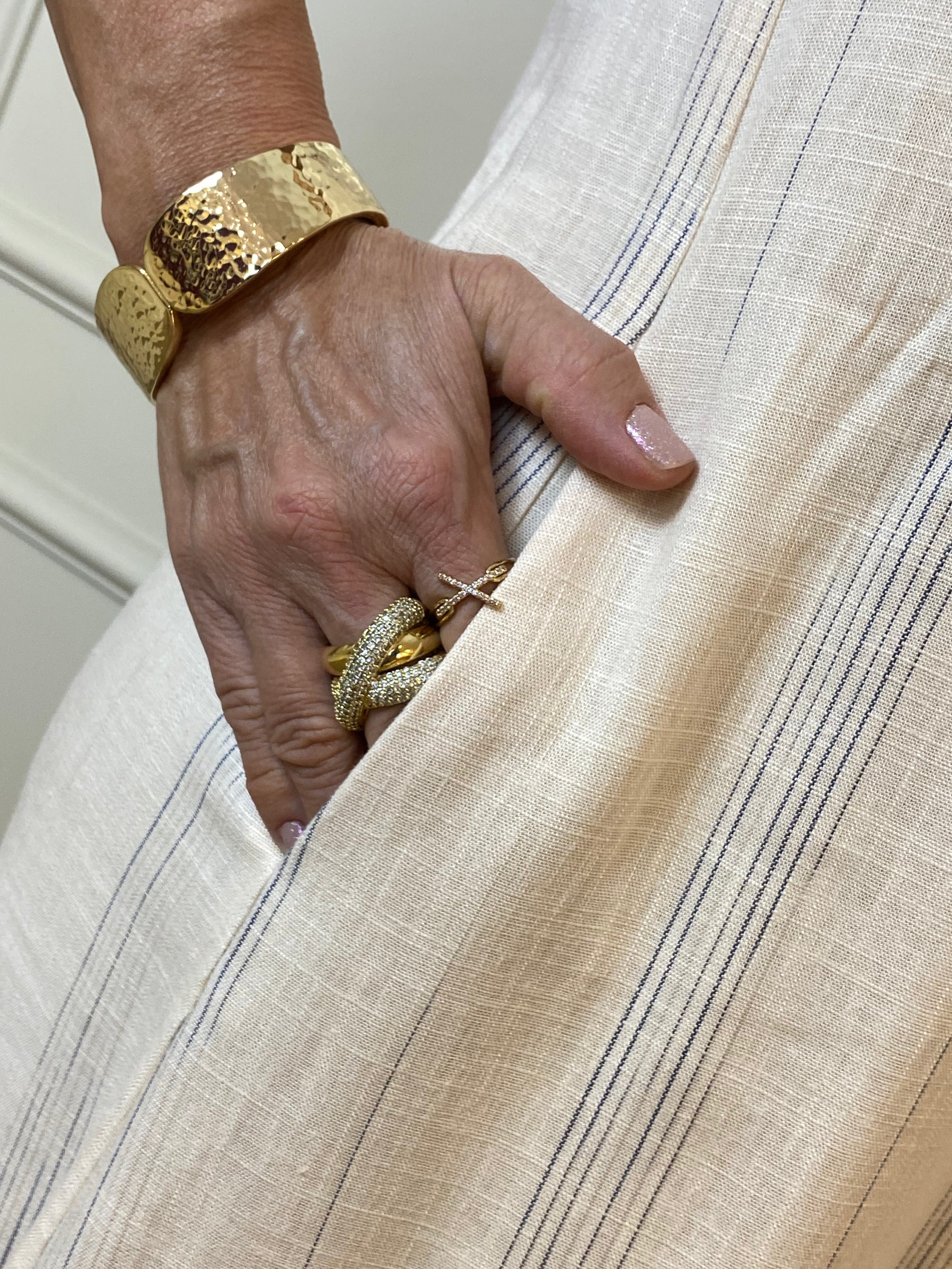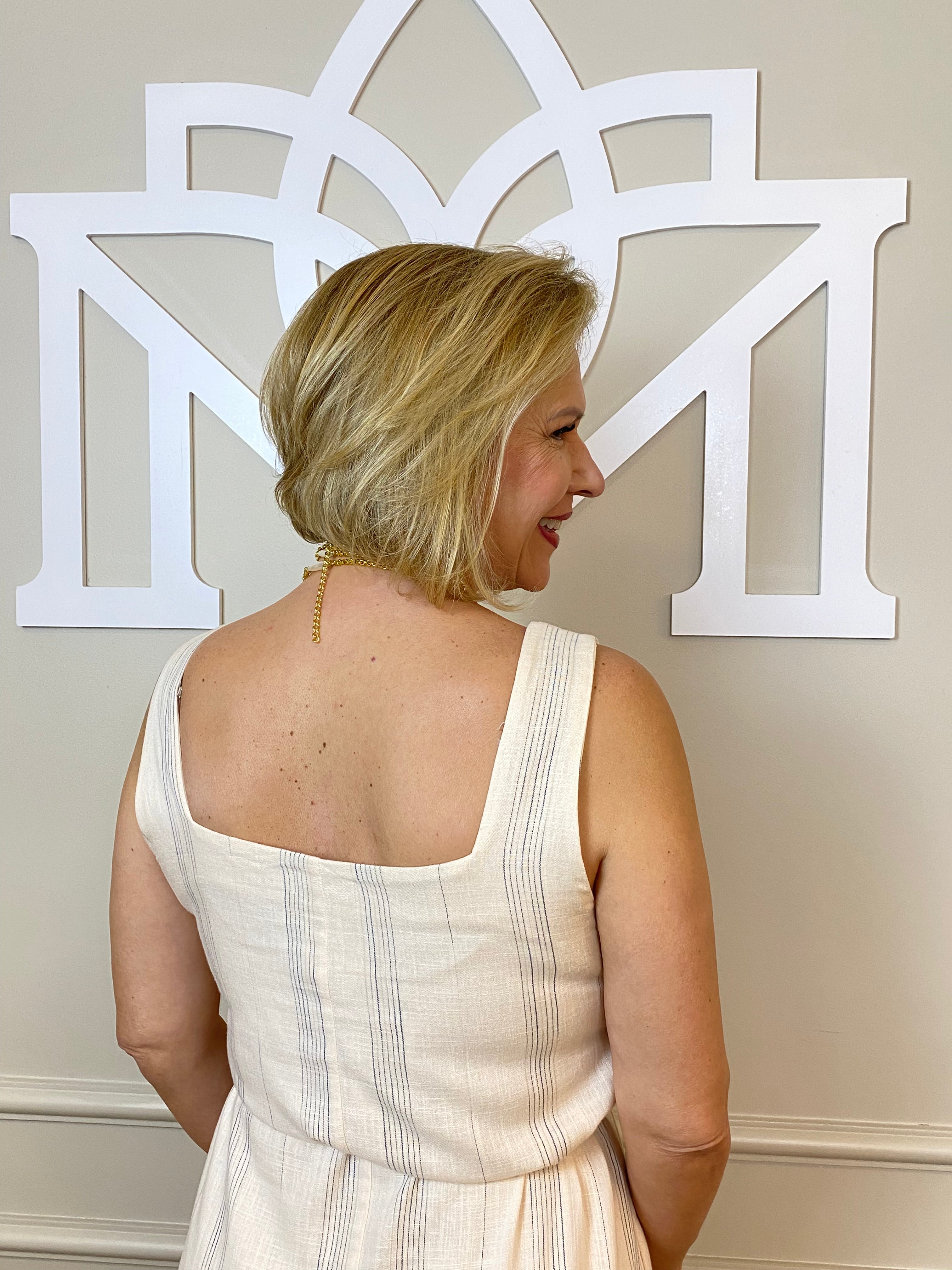 Esse vestido é um modelo longo, confeccionado em tecido leve de tom claro com listras discretas verticais, que alongam a silhueta. Possui decote quadrado e alças largas, proporcionando conforto e sofisticação. A cintura é marcada por um cordão com ponteiras tassel, que traz um detalhe delicado e ajustável. O caimento solto garante frescor e movimento, tornando a peça ideal para ocasiões casuais elegantes ou eventos ao ar livre.