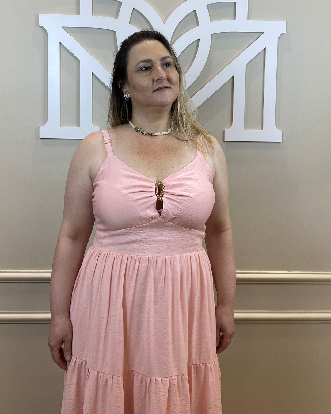 O vestido da imagem é longo, em tom de rosa claro, confeccionado em tecido leve e fluido. Possui alças médias, decote em “V” com detalhe franzido no busto e aplicação central em argola decorativa, que valoriza a região do colo. A cintura é levemente marcada e a saia apresenta recortes em camadas com babados sutis, proporcionando movimento e caimento suave. O modelo transmite um estilo romântico e delicado, ideal para ocasiões casuais ou eventos durante o dia.