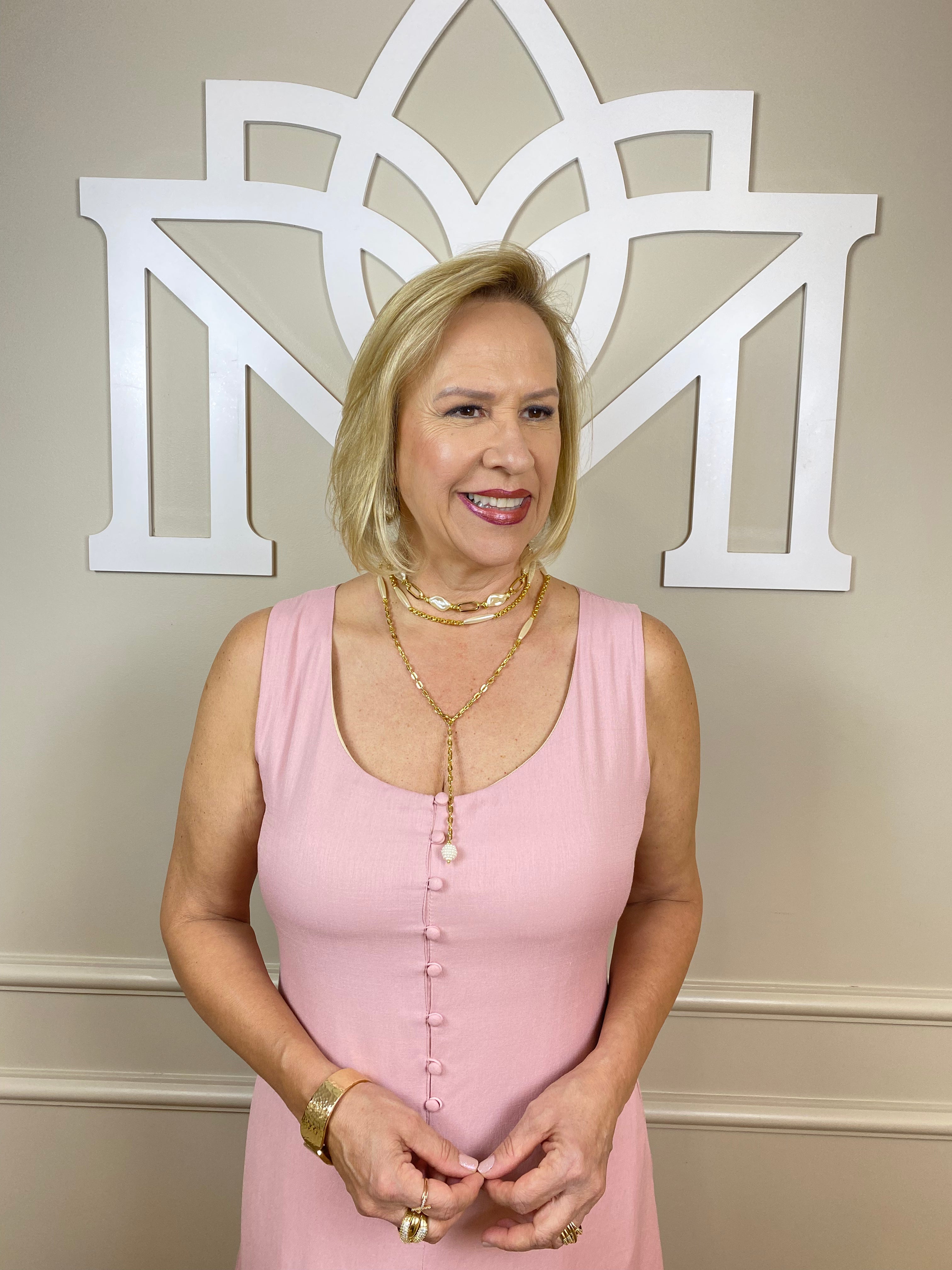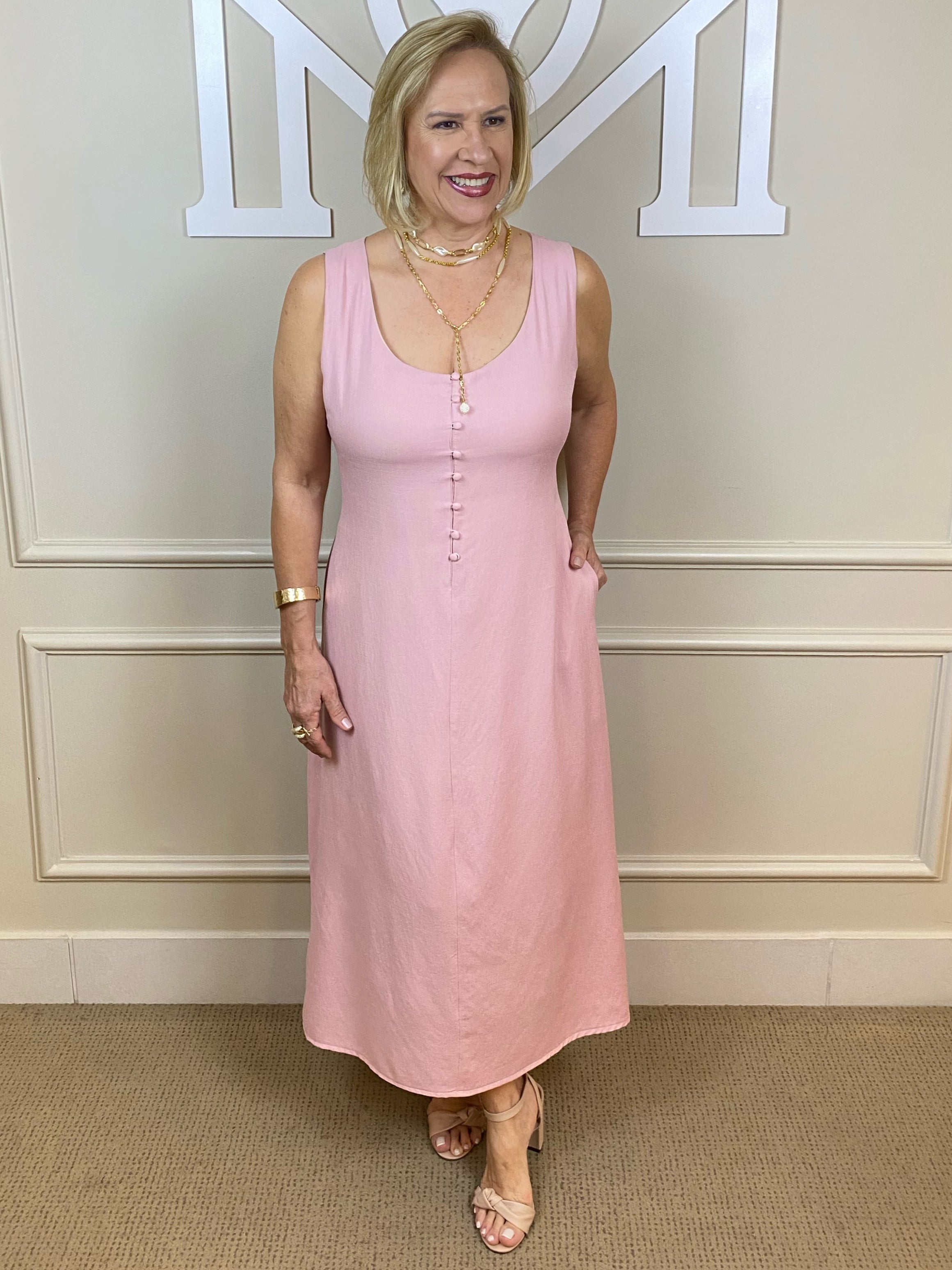 O vestido da imagem é um modelo midi na cor rosé (rosa claro), confeccionado em um tecido leve e fluido, com caimento solto e elegante. Ele possui decote arredondado e alças largas, proporcionando um visual delicado e sofisticado. A parte frontal é adornada com botões forrados no mesmo tecido, que vão do busto até a altura da cintura, acrescentando um toque de charme.
