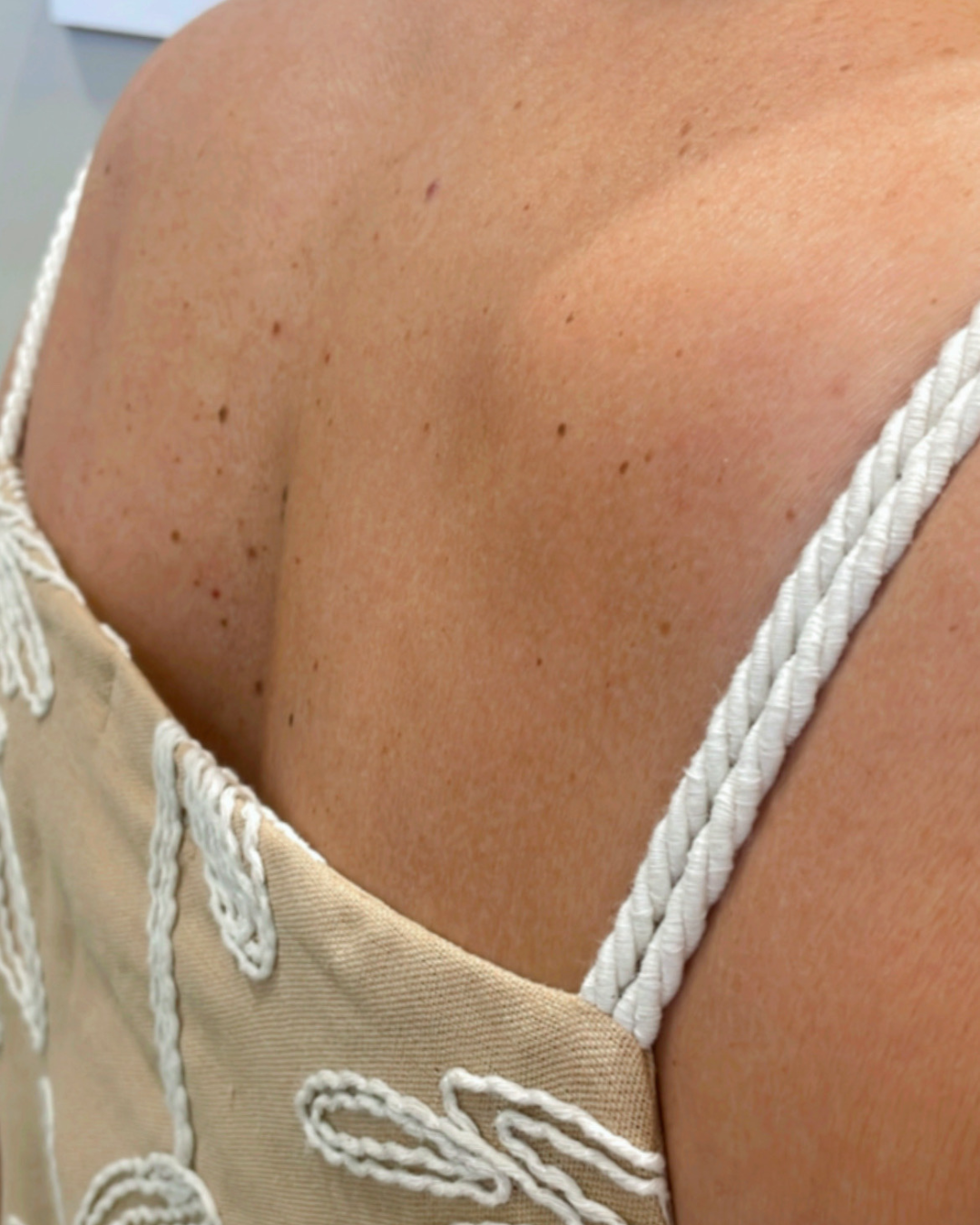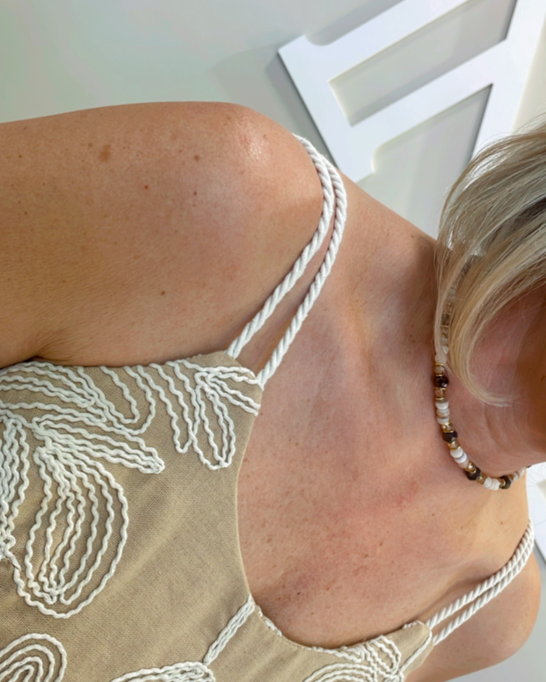 O look da foto é composto por um vestido midi de alcinhas finas em tom bege/nude com bordados florais brancos em toda a peça. O tecido é leve e fluido, ideal para conforto de verão ou eventos diurnos. O modelo tem caimento solto, conforto e moda, além de uma fenda lateral que dá movimento.