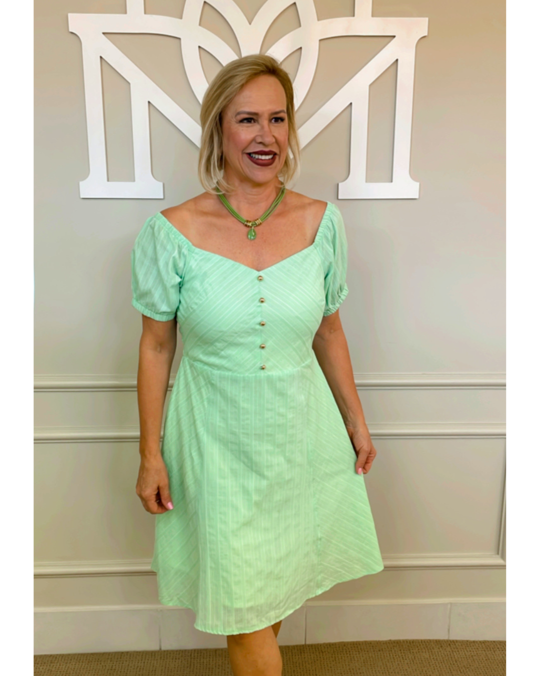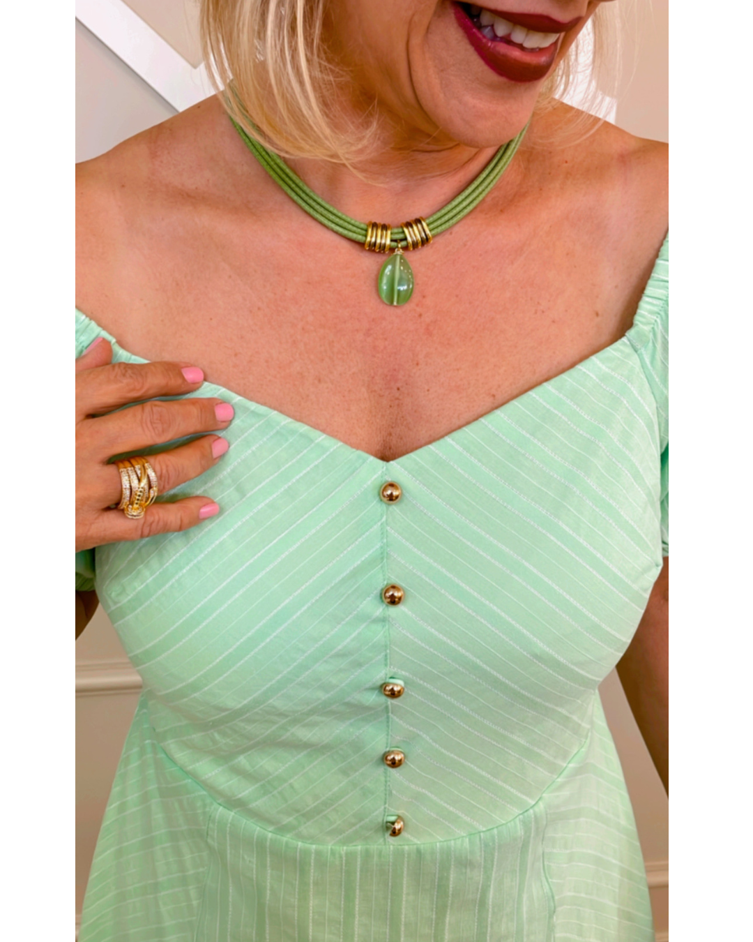 Esse vestido é um modelo midi super feminino e delicado, em tom verde menta claro, perfeito para dias alegres e ocasiões especiais.